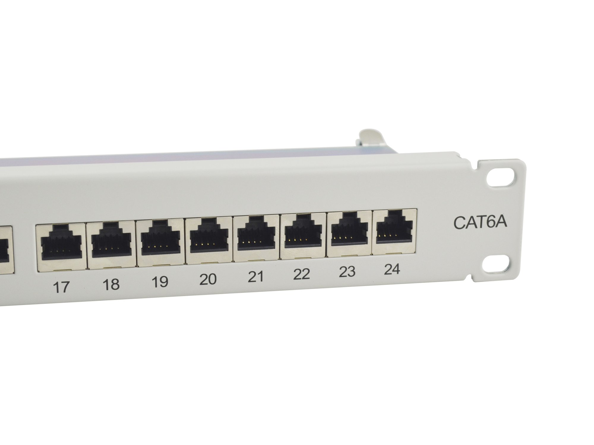 Equip 24-Port Cat.6A Shielded Patch Panel, Light Grey. Cabling technology: 10/100/1000Base-T(X), Ethernet interface type: Gigabit Ethernet, Maximum data transfer rate: 1000 Mbit/s. Product colour: Grey, Material: Steel, Mounting: Rack mounting. Compliance certificates: RoHS. Width: 125 mm, Height: 44.5 mm, Depth: 482.6 mm. Package type: Box