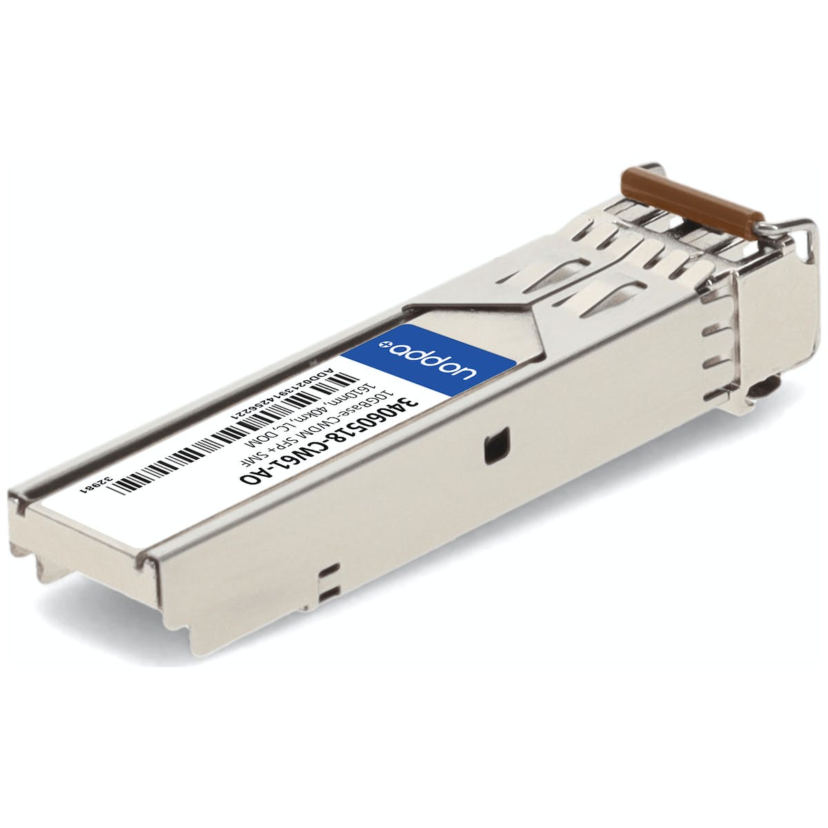 AddOn Networks 34060518-CW61-AO. SFP transceiver type: Fiber optic, Maximum data transfer rate: 10000 Mbit/s, Interface type: SFP+. Product colour: Silver, Brand compatibility: Huawei. Certification: TAA. Quantity per pack: 1 pc(s). Package width: 70 mm, Package depth: 120.7 mm, Package height: 30.5 mm