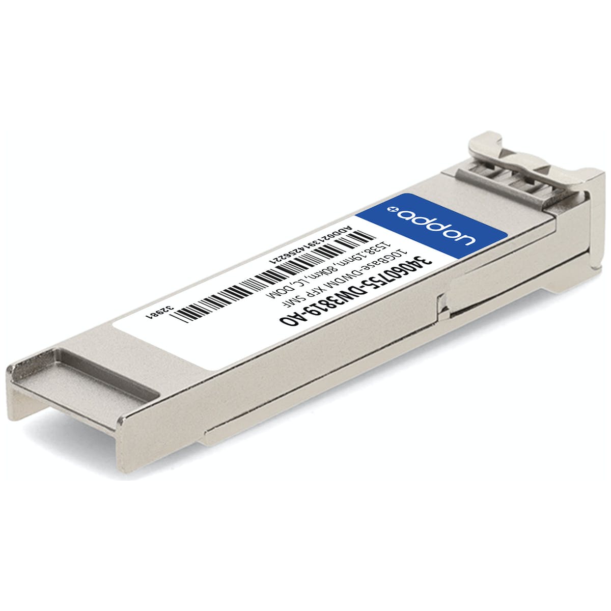 AddOn Networks 34060755-DW3819-AO. SFP transceiver type: Fiber optic, Maximum data transfer rate: 10000 Mbit/s, Interface type: XFP. Product colour: Silver, Brand compatibility: Huawei. Certification: TAA. Quantity per pack: 1 pc(s). Package width: 70 mm, Package depth: 120.7 mm, Package height: 30.5 mm