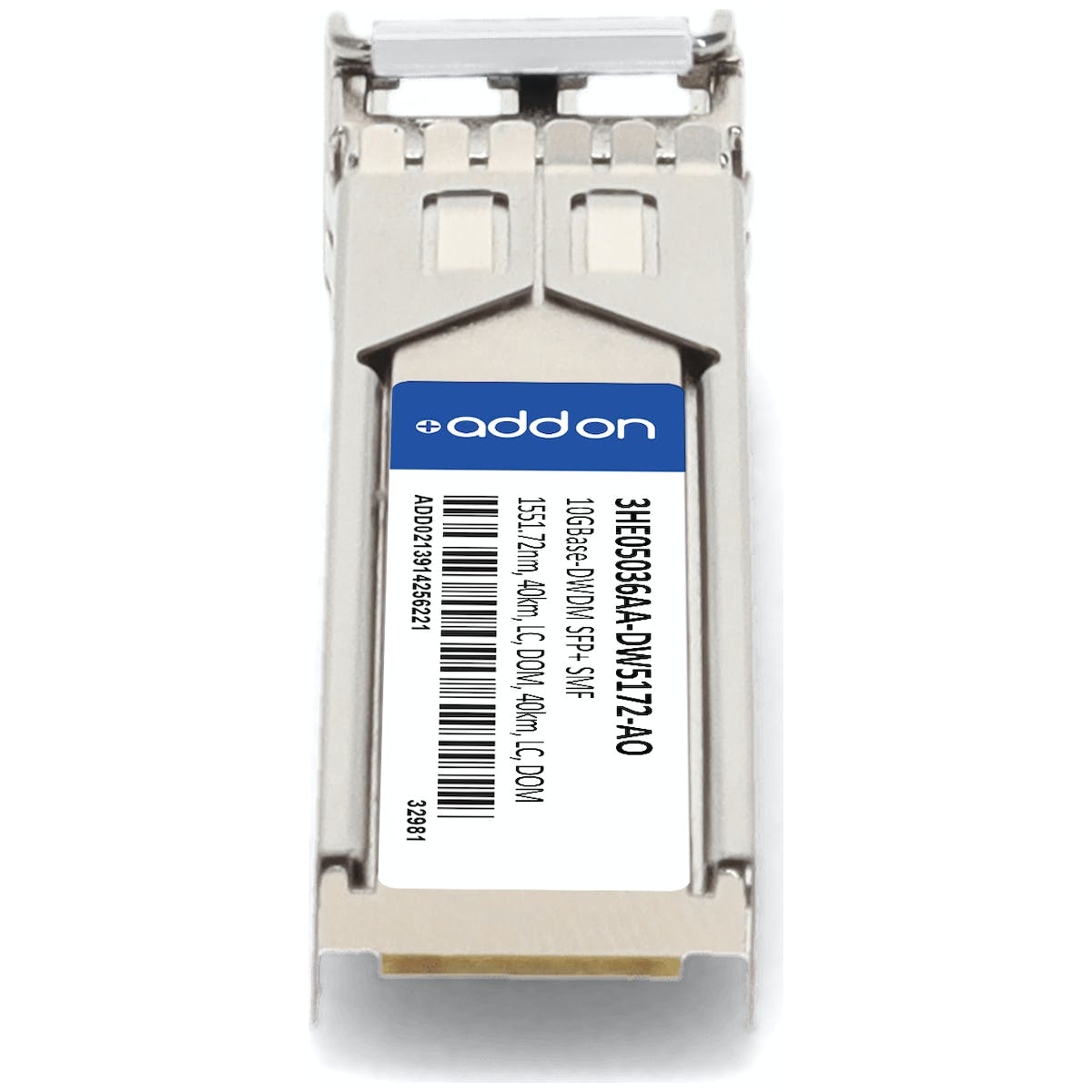 AddOn Networks 3HE05036AA-DW5172-AO. SFP transceiver type: Fiber optic, Maximum data transfer rate: 10000 Mbit/s, Interface type: SFP+. Product colour: Metallic, Housing material: Metal. Compliance certificates: RoHS. Doesn't contain: Lead. Width: 14.3 mm, Depth: 56.6 mm, Height: 11.7 mm