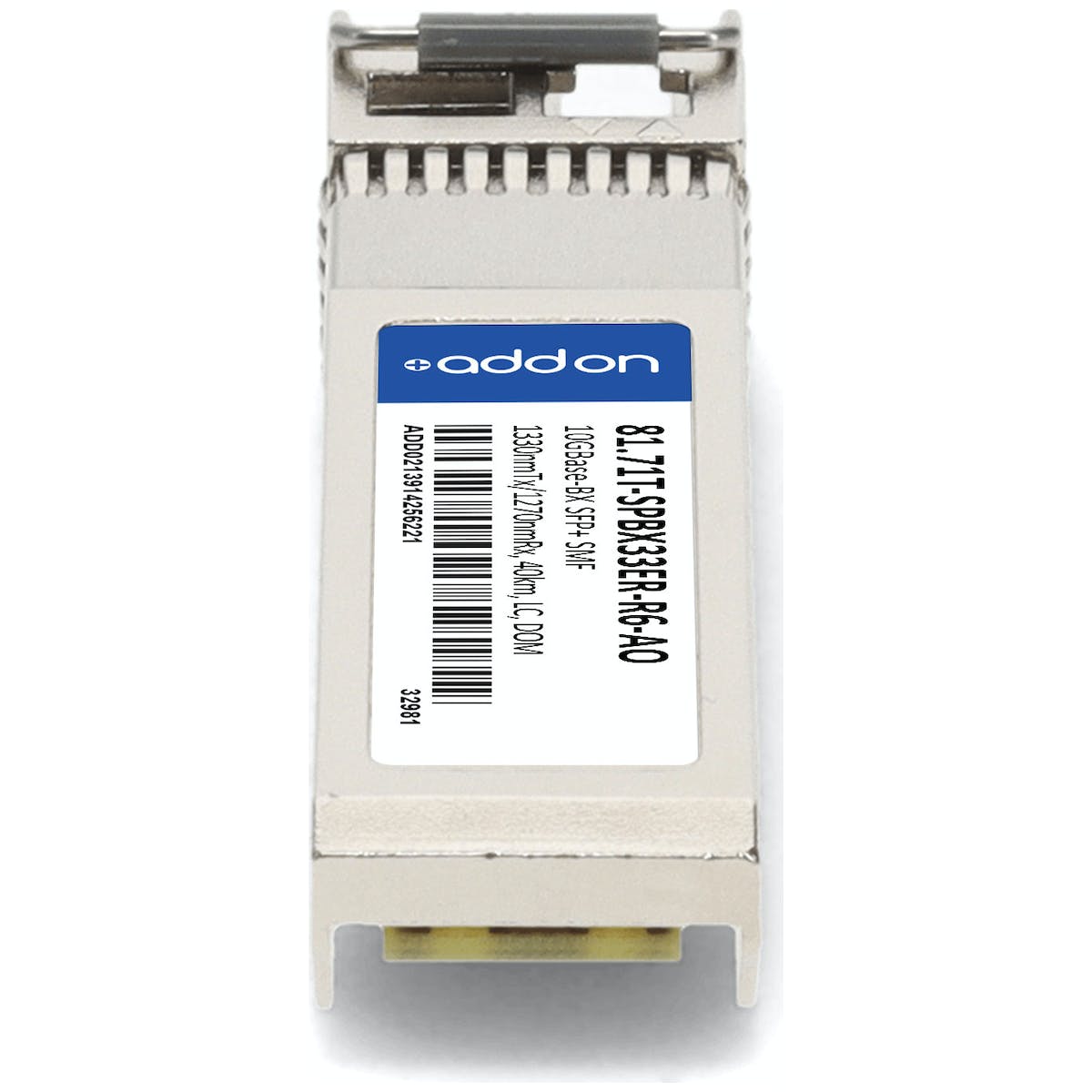 AddOn Networks 81.71T-SPBX33ER-R6-AO. SFP transceiver type: Fiber optic, Maximum data transfer rate: 10000 Mbit/s, Interface type: SFP+. Product colour: Silver. Certification: TAA. Quantity per pack: 1 pc(s). Package width: 70 mm, Package depth: 120.7 mm, Package height: 30.5 mm