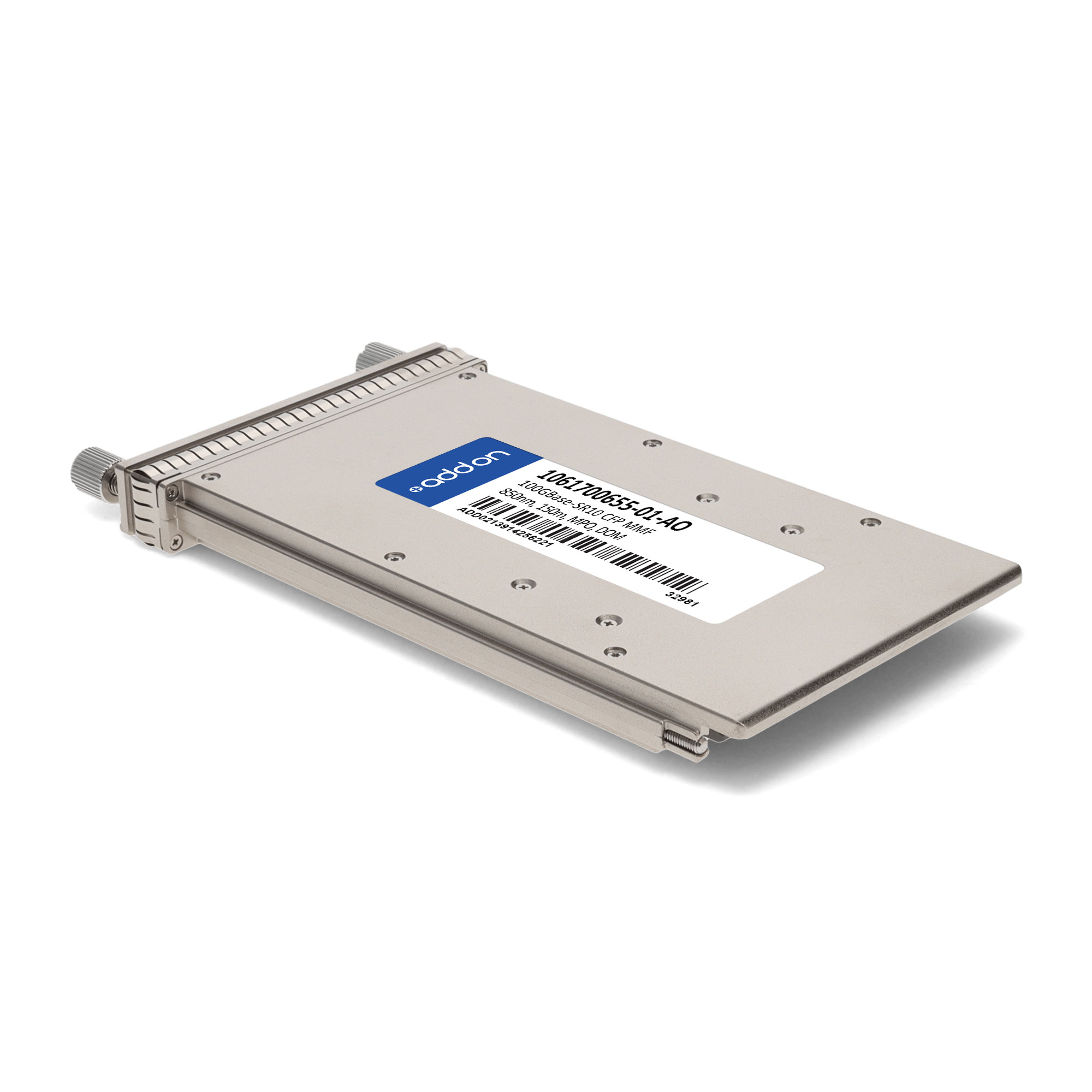 AddOn Networks ADVA 1061700655-01 Compatible TAA Compliant 100GBase-LR4 CFP Transceiver (SMF, 1310nm, 10km, LC, DOM). SFP transceiver type: Fiber optic, Maximum data transfer rate: 100000 Mbit/s, Interface type: CFP. Form factor: CFP, Brand compatibility: ADVA, Compatibility: 1061700655-01. Compliance certificates: Trade Agreements Act (TAA). Quantity per pack: 1 pc(s). Package width: 133 mm, Package depth: 32 mm, Package height: 197 mm