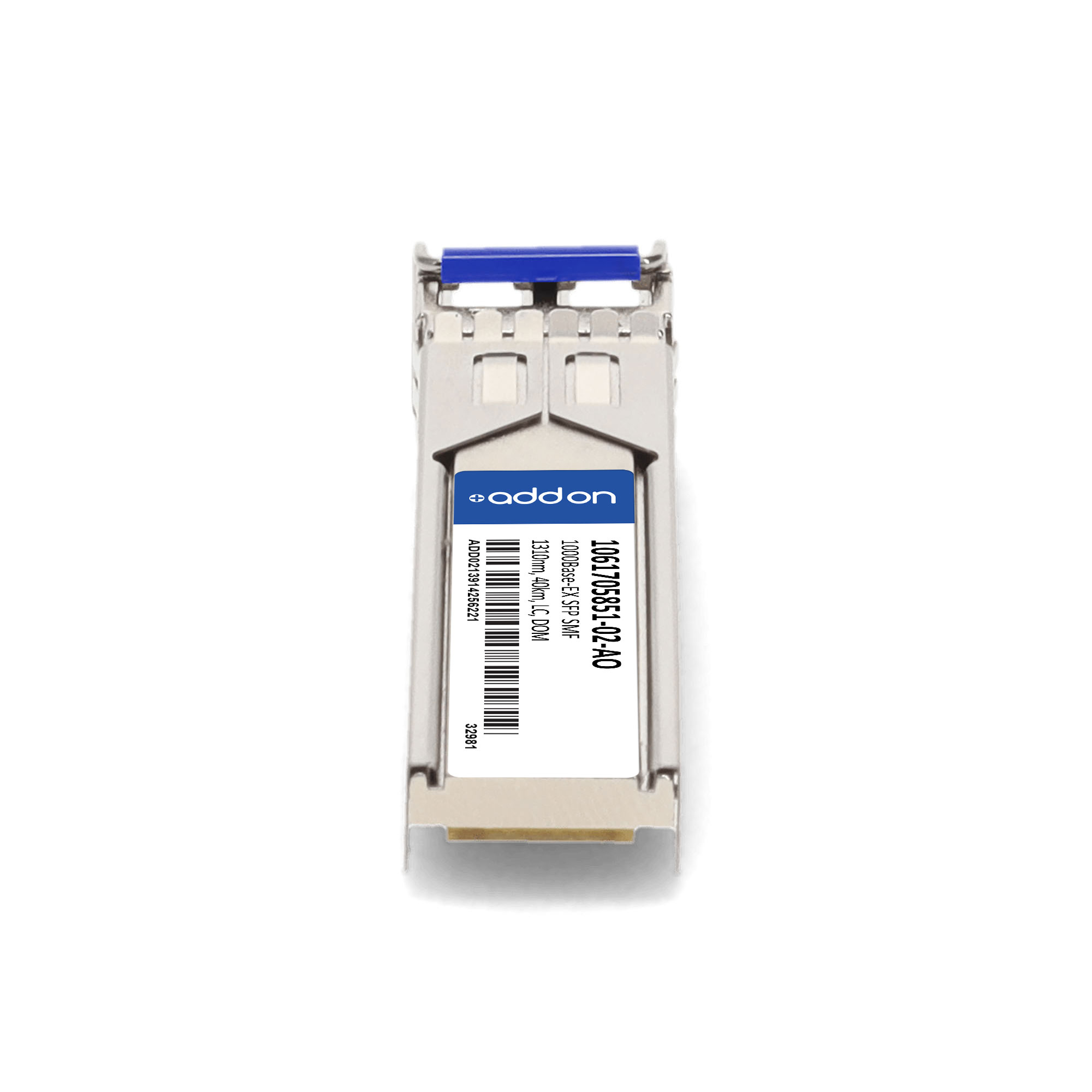AddOn Networks ADVA 1061705851-02 Compatible TAA 1000Base-EX SFP Transceiver (SMF, 1310nm, 40km, LC, DOM). SFP transceiver type: Fiber optic, Maximum data transfer rate: 1000 Mbit/s, Interface type: SFP. Form factor: SFP, Brand compatibility: ADVA. Compliance certificates: Trade Agreements Act (TAA). Quantity per pack: 1 pc(s). Package width: 70 mm, Package depth: 121 mm, Package height: 30 mm
