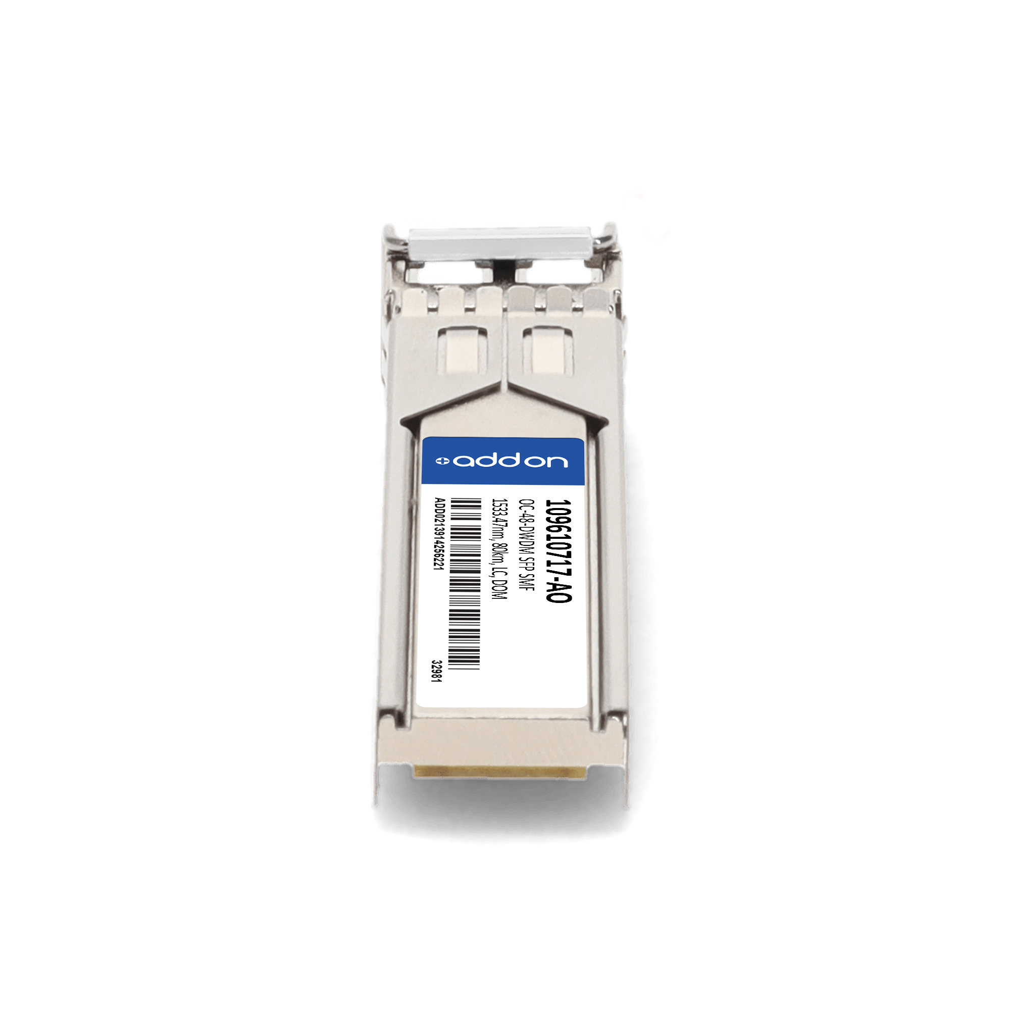 AddOn Networks Alcatel-Lucent Nokia 109610717 Compatible TAA Compliant OC-48-DWDM 100GHz SFP Transceiver (SMF, 1533.47nm, 80km, LC, DOM). SFP transceiver type: Fiber optic, Maximum data transfer rate: 2488 Mbit/s, Interface type: SFP. Form factor: SFP, Brand compatibility: Alcatel-Lucent / Nokia. Compliance certificates: Trade Agreements Act (TAA). Quantity per pack: 1 pc(s). Package width: 70 mm, Package depth: 121 mm, Package height: 30 mm