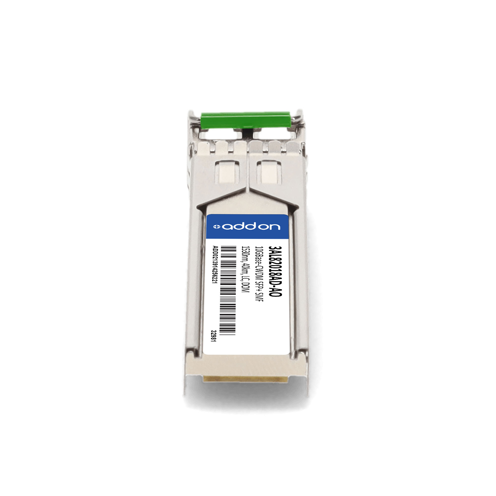 AddOn Networks Alcatel-Lucent Nokia 3AL82018AD Compatible 10GBase-CWDM SFP+ Transceiver (SMF, 1530nm, 40km, LC, DOM, -5 to +85C). SFP transceiver type: Fiber optic, Maximum data transfer rate: 10000 Mbit/s, Interface type: SFP+. Form factor: SFP+, Brand compatibility: Alcatel-Lucent / Nokia, Compatibility: 3AL82018AD. Compliance certificates: Trade Agreements Act (TAA). Quantity per pack: 1 pc(s). Package width: 70 mm, Package depth: 121 mm, Package height: 30 mm