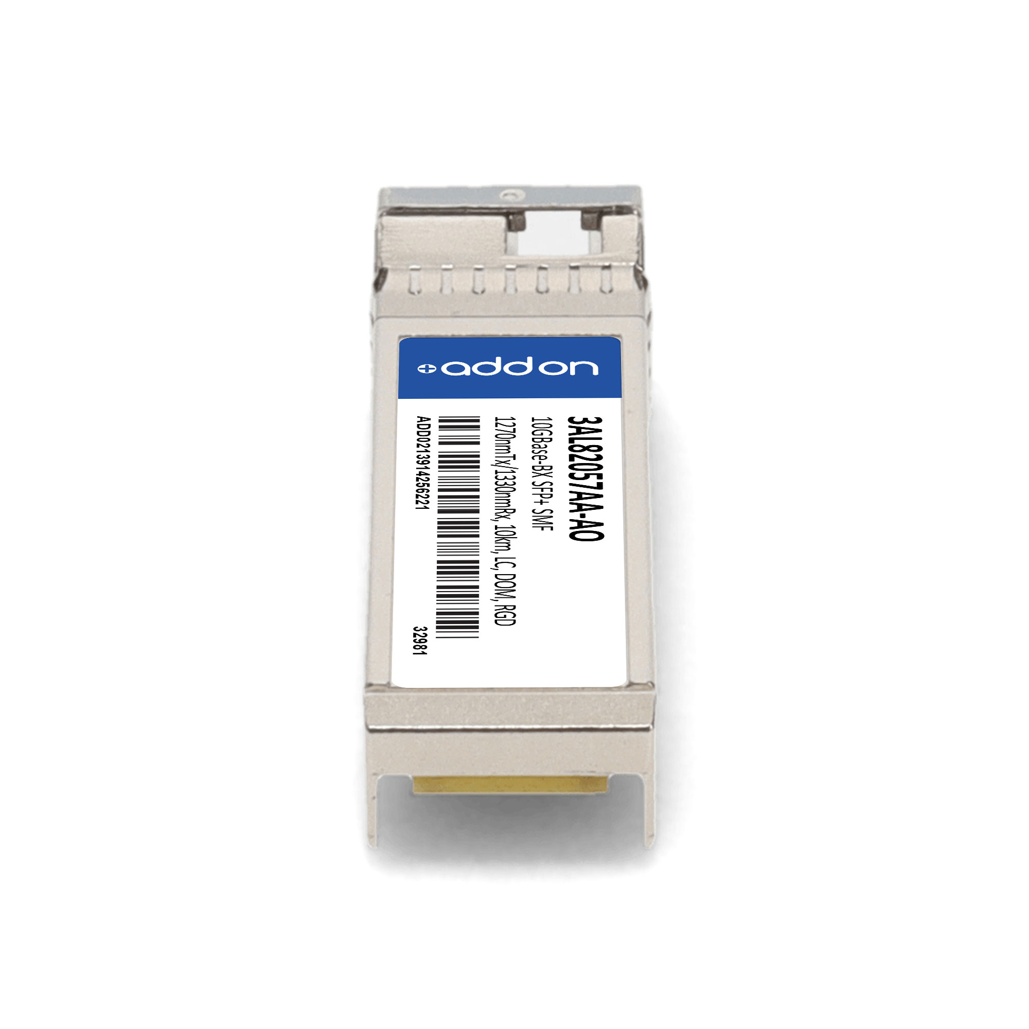 AddOn Networks Alcatel-Lucent Nokia 3AL82057AA Compatible TAA 10GBase-BX SFP+ Transceiver (SMF, 1270nmTx/1330nmRx, 10km, LC, DOM, -40 to 85C). SFP transceiver type: Fiber optic, Maximum data transfer rate: 10000 Mbit/s, Interface type: SFP+. Form factor: SFP+, Brand compatibility: Alcatel-Lucent / Nokia, Compatibility: 3AL82057AA. Compliance certificates: Trade Agreements Act (TAA). Quantity per pack: 1 pc(s). Package width: 70 mm, Package depth: 121 mm, Package height: 30 mm
