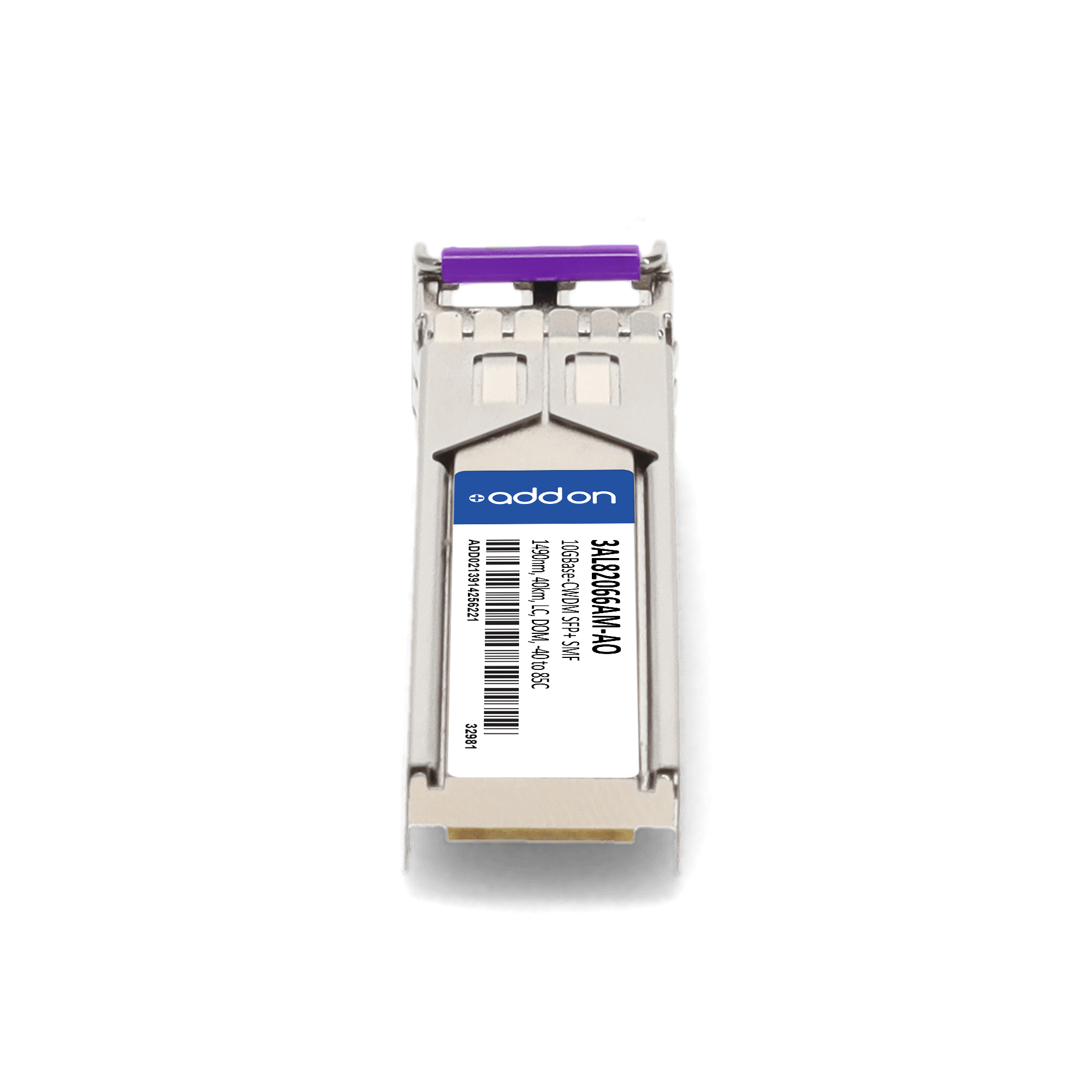 AddOn Networks Alcatel-Lucent Nokia 3AL82066AM Compatible TAA 10GBase-CWDM SFP+ Transceiver (SMF, 1490nm, 40km, LC, DOM, -40 to 85C). SFP transceiver type: Fiber optic, Maximum data transfer rate: 10000 Mbit/s, Interface type: SFP+. Form factor: SFP+, Brand compatibility: Alcatel-Lucent / Nokia, Compatibility: 3AL82066AM. Compliance certificates: Trade Agreements Act (TAA). Quantity per pack: 1 pc(s). Package width: 70 mm, Package depth: 121 mm, Package height: 30 mm