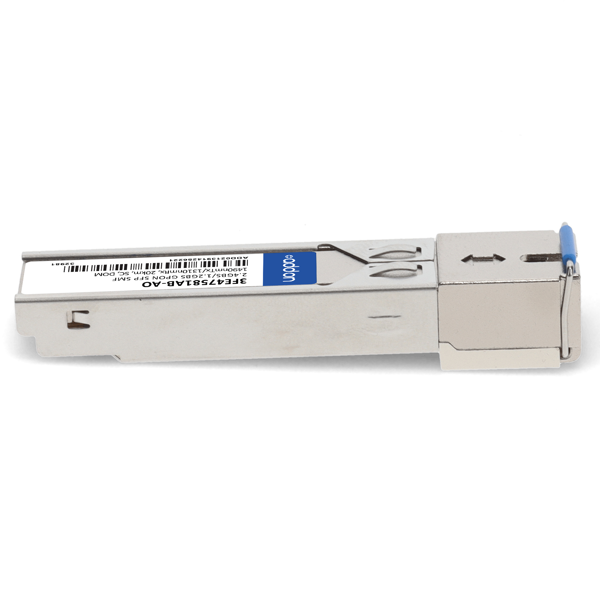 AddOn Networks Alcatel-Lucent Nokia 3FE47581AD Compatible TAA Combo PON OLT (SMF, 1577nmTx/1270nmRx and 1490nmTx/1310nmRx, N1/B+, SC, DOM). SFP transceiver type: Fiber optic, Maximum data transfer rate: 9950 Mbit/s, Fiber optic connector: SC. Brand compatibility: Alcatel-Lucent / Nokia. Compliance certificates: Trade Agreements Act (TAA). Quantity per pack: 1 pc(s). Package width: 70 mm, Package depth: 121 mm, Package height: 30 mm |