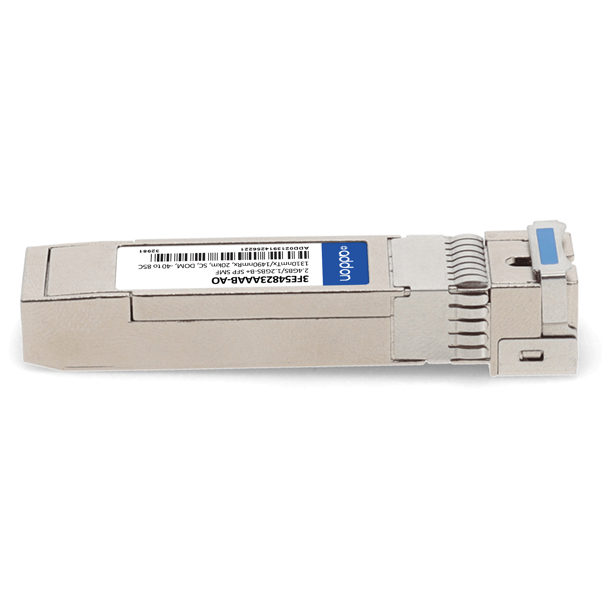 AddOn Networks Alcatel-Lucent Nokia 3FE54823AAAB Compatible TAA 2.4Gbs/1.2Gbs-B+ SFP Transceiver (SMF, 1310nmTx/1490nmRx, 20km, SC, DOM, -40 to 85C). SFP transceiver type: Fiber optic, Maximum data transfer rate: 2400 Mbit/s, Interface type: SFP. Form factor: SFP, Brand compatibility: Alcatel-Lucent / Nokia, Compatibility: 3FE54823AAAB. Compliance certificates: Trade Agreements Act (TAA). Quantity per pack: 1 pc(s). Package width: 70 mm, Package depth: 121 mm, Package height: 30 mm |