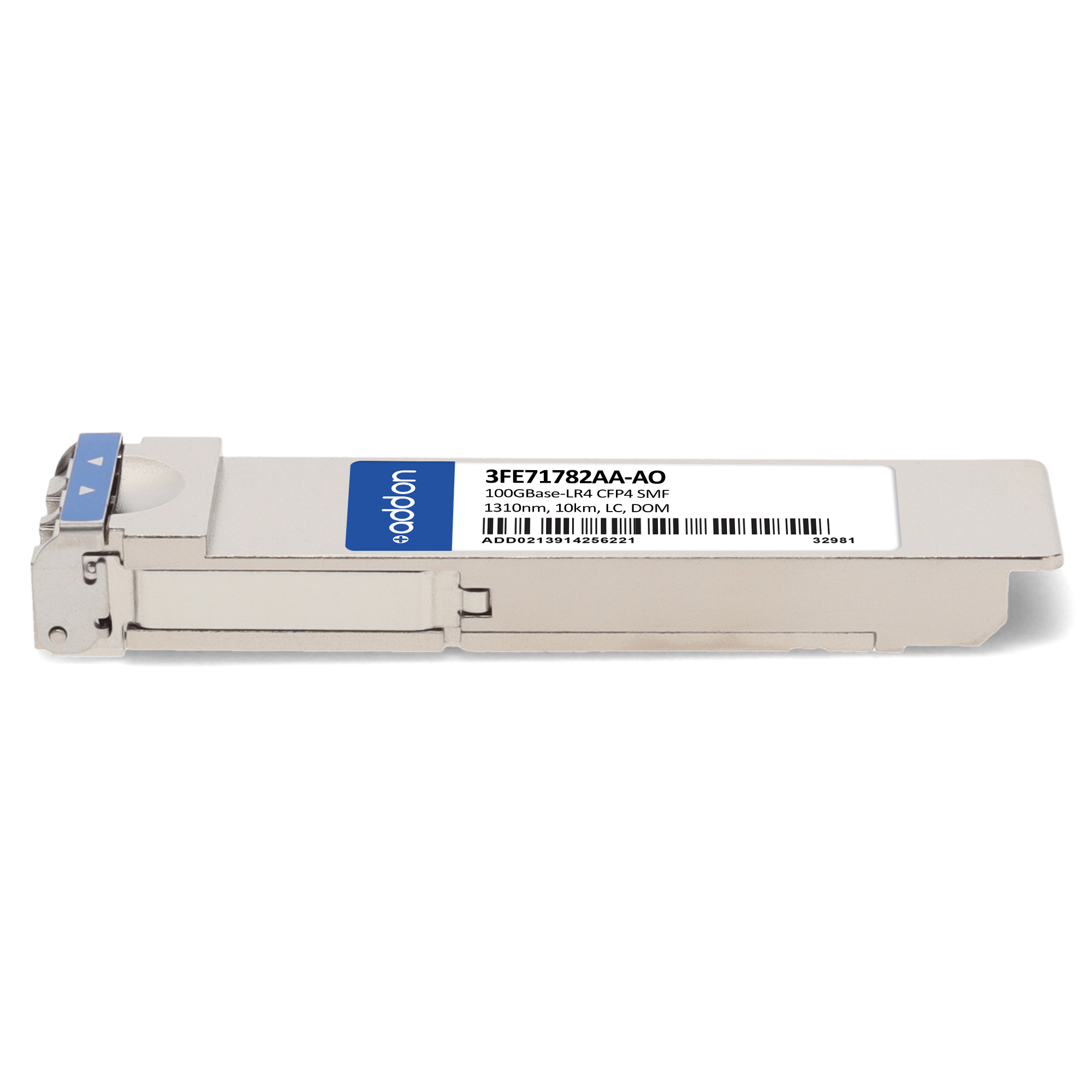 AddOn Networks Alcatel-Lucent Nokia 3FE71782AA Compatible TAA 100GBase-LR4 CFP4 Transceiver (SMF, 1310nm, 10km, LC, DOM). SFP transceiver type: Fiber optic, Maximum data transfer rate: 100000 Mbit/s, Interface type: CFP4. Form factor: CFP4, Brand compatibility: Alcatel-Lucent / Nokia, Compatibility: 3FE71782AA. Compliance certificates: Trade Agreements Act (TAA). Quantity per pack: 1 pc(s). Package width: 70 mm, Package depth: 121 mm, Package height: 30 mm