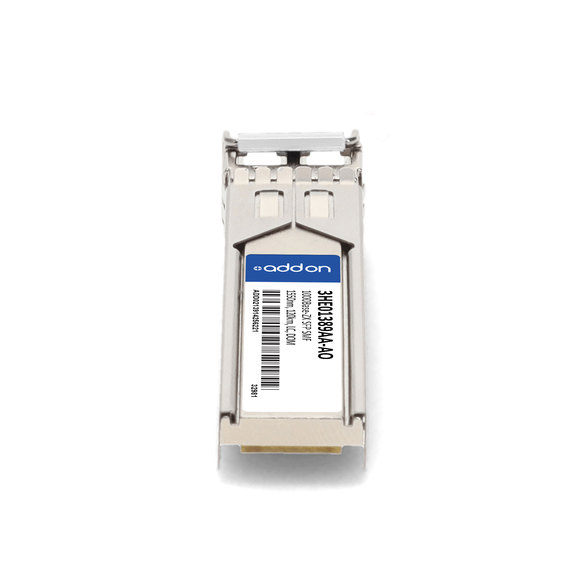 AddOn Networks Alcatel-Lucent Nokia 3HE01389AA Compatible TAA 1000Base-ZX SFP Transceiver (SMF, 1550nm, 120km, LC, DOM). SFP transceiver type: Fiber optic, Maximum data transfer rate: 1000 Mbit/s, Interface type: SFP. Form factor: SFP, Brand compatibility: Alcatel-Lucent / Nokia, Compatibility: 3HE01389AA. Compliance certificates: Trade Agreements Act (TAA). Quantity per pack: 1 pc(s). Package width: 70 mm, Package depth: 121 mm, Package height: 30 mm