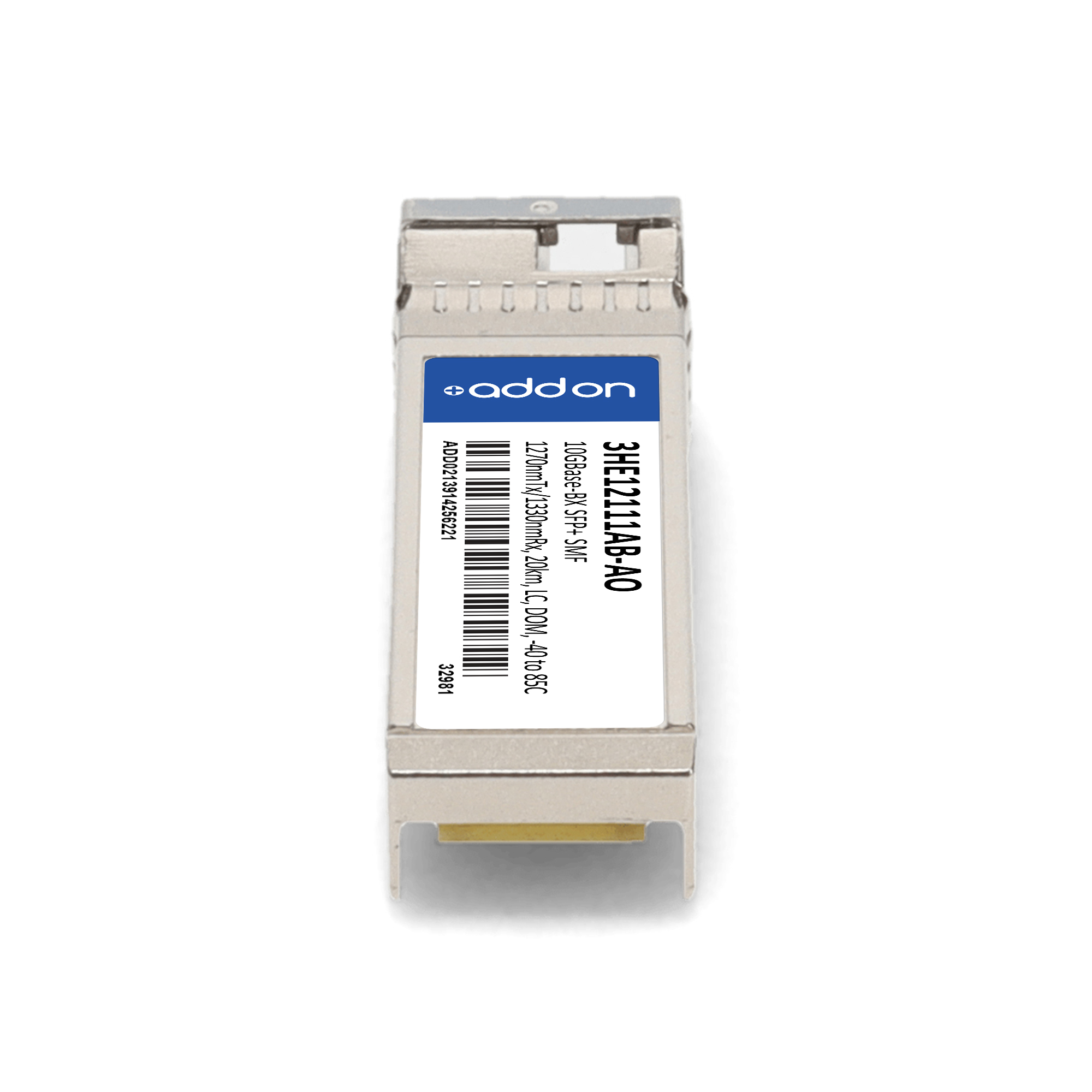 AddOn Networks Alcatel-Lucent Nokia 3HE12111AB Compatible TAA 10GBase-BX SFP+ Transceiver (SMF, 1270nmTx/1330nmRx, 20km, LC, DOM, -40 to 85C). SFP transceiver type: Fiber optic, Maximum data transfer rate: 10000 Mbit/s, Interface type: SFP+. Form factor: SFP+, Brand compatibility: Alcatel-Lucent / Nokia, Compatibility: 3HE12111AB. Compliance certificates: Trade Agreements Act (TAA). Quantity per pack: 1 pc(s). Package width: 70 mm, Package depth: 121 mm, Package height: 30 mm