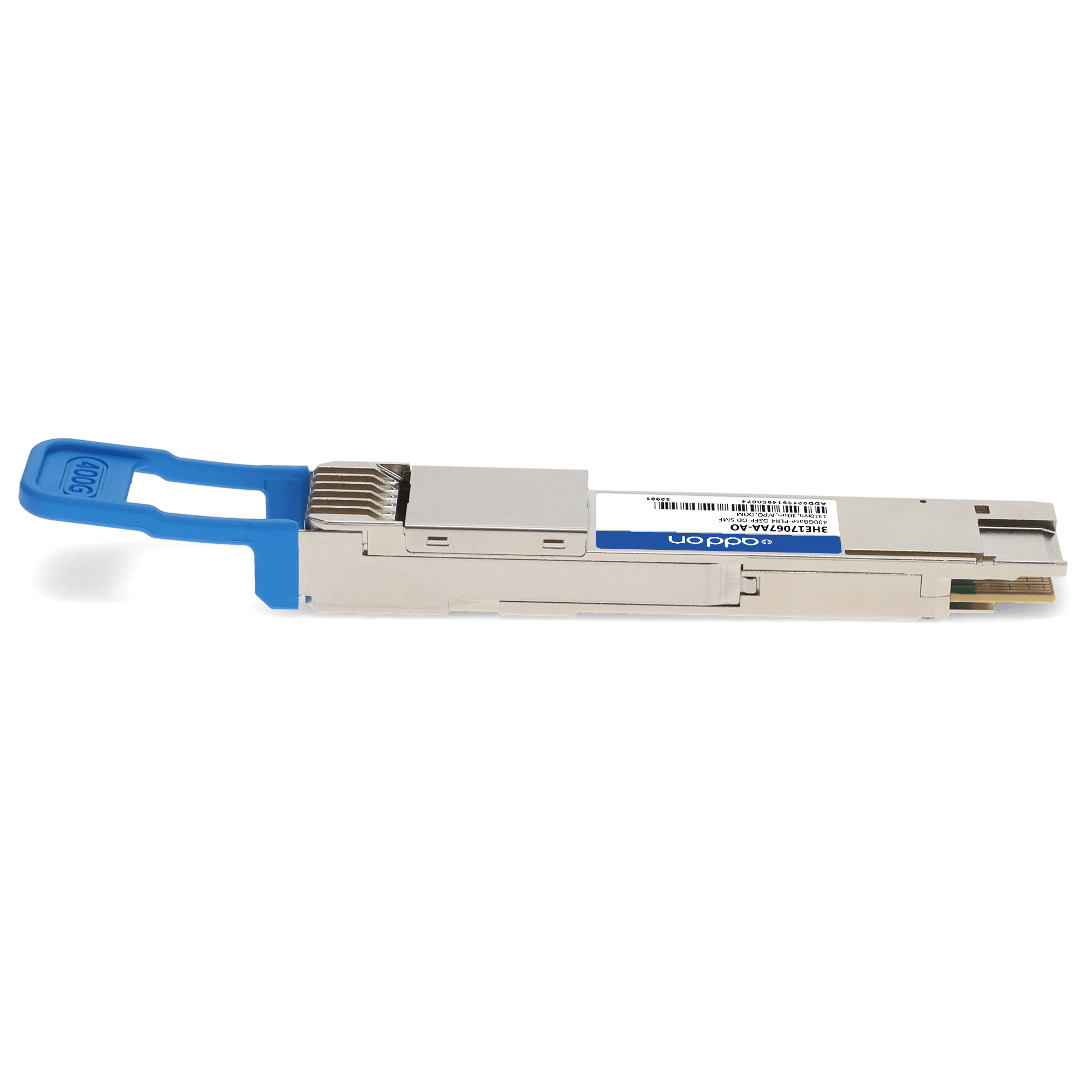 AddOn Networks Alcatel-Lucent Nokia 3HE17067AA Compatible TAA 400GBase-PLR4 QSFP-DD Transceiver (SMF, 1310nm, 10km, MPO, DOM, CMIS 4.0). SFP transceiver type: Fiber optic, Maximum data transfer rate: 400000 Mbit/s, Interface type: QSFP-DD. Form factor: QSFP-DD, Brand compatibility: Alcatel-Lucent / Nokia, Compatibility: 3HE17067AA. Compliance certificates: Trade Agreements Act (TAA). Quantity per pack: 1 pc(s). Package width: 70 mm, Package depth: 121 mm, Package height: 30 mm