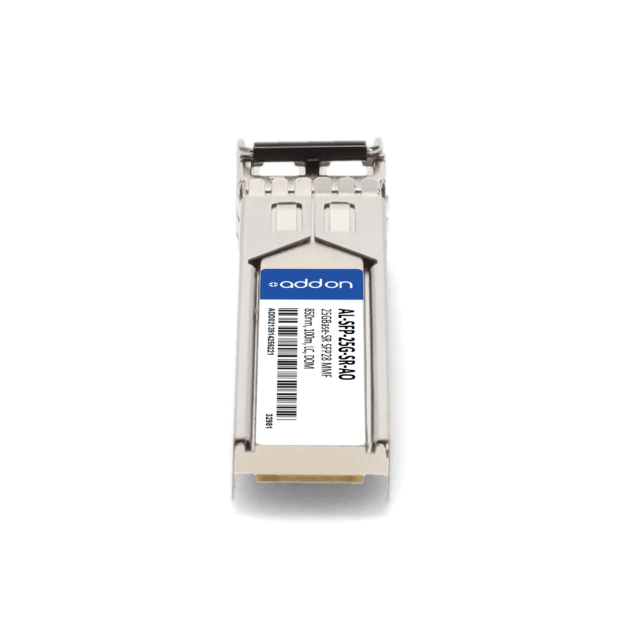 AddOn Networks Alcatel-Lucent Nokia AL-SFP-25G-SR Compatible TAA 25GBase-SR SFP28 Transceiver (MMF, 850nm, 100m, LC, DOM). SFP transceiver type: Fiber optic, Maximum data transfer rate: 25000 Mbit/s, Interface type: SFP28. Form factor: SFP28, Brand compatibility: Alcatel-Lucent / Nokia. Compliance certificates: Trade Agreements Act (TAA). Quantity per pack: 1 pc(s). Package width: 70 mm, Package depth: 121 mm, Package height: 30 mm
