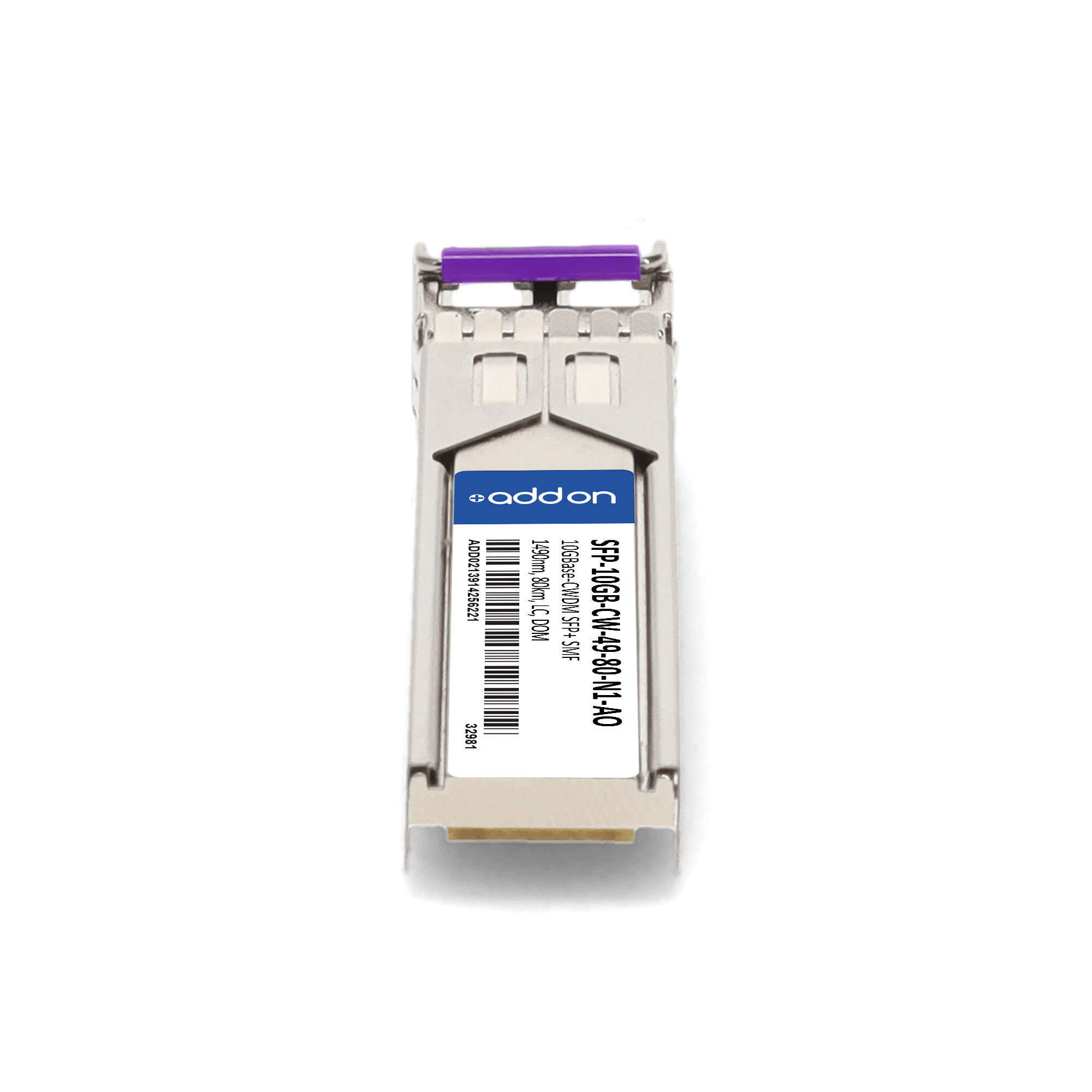 AddOn Networks Alcatel-Lucent Nokia Compatible TAA 10GBase-CWDM SFP+ Transceiver (SMF, 1490nm, 80km, LC, DOM). SFP transceiver type: Fiber optic, Maximum data transfer rate: 10000 Mbit/s, Interface type: SFP+. Product colour: Silver, Form factor: SFP+, Brand compatibility: Alcatel-Lucent / Nokia. Compliance certificates: Trade Agreements Act (TAA). Quantity per pack: 1 pc(s). Package width: 70 mm, Package depth: 121 mm, Package height: 30 mm