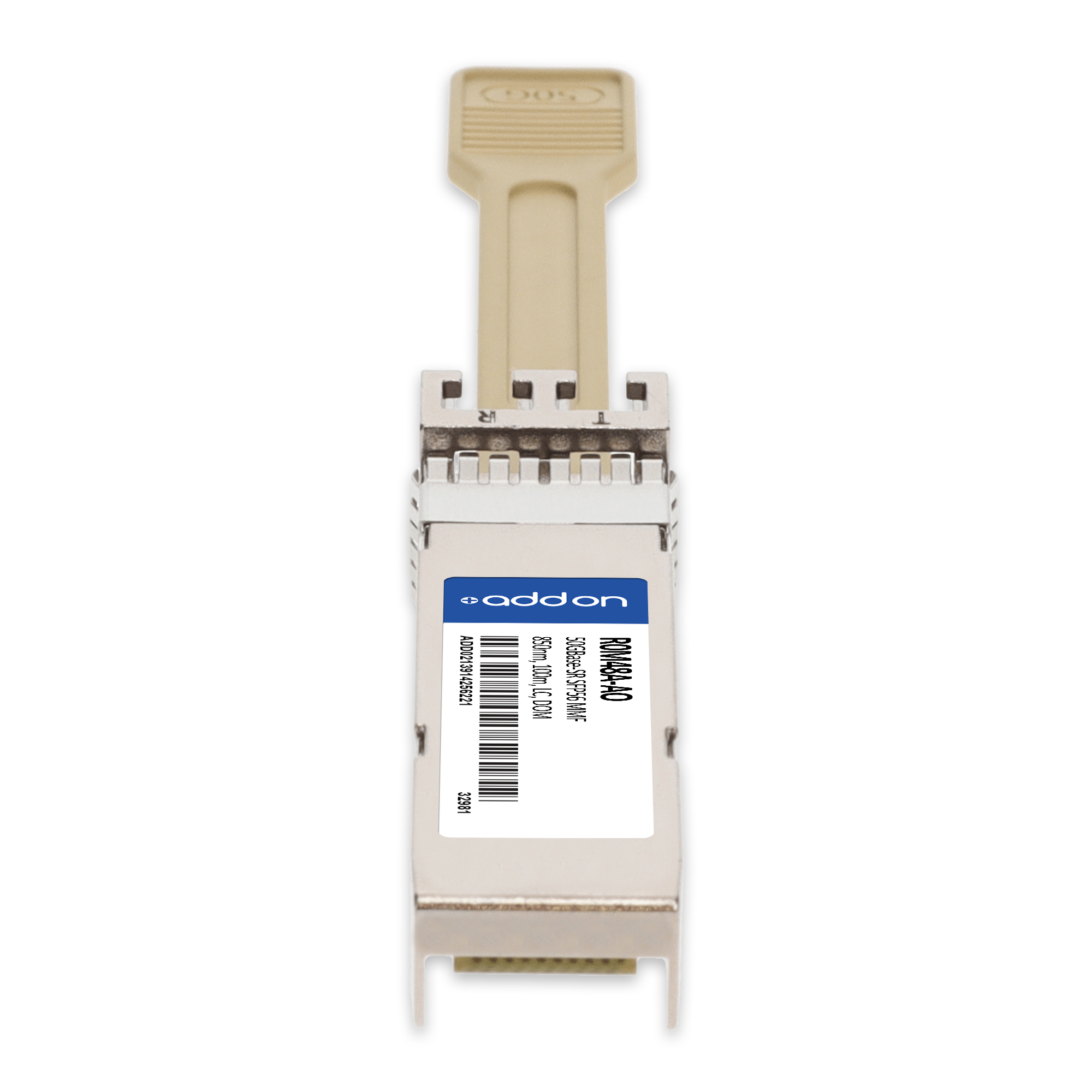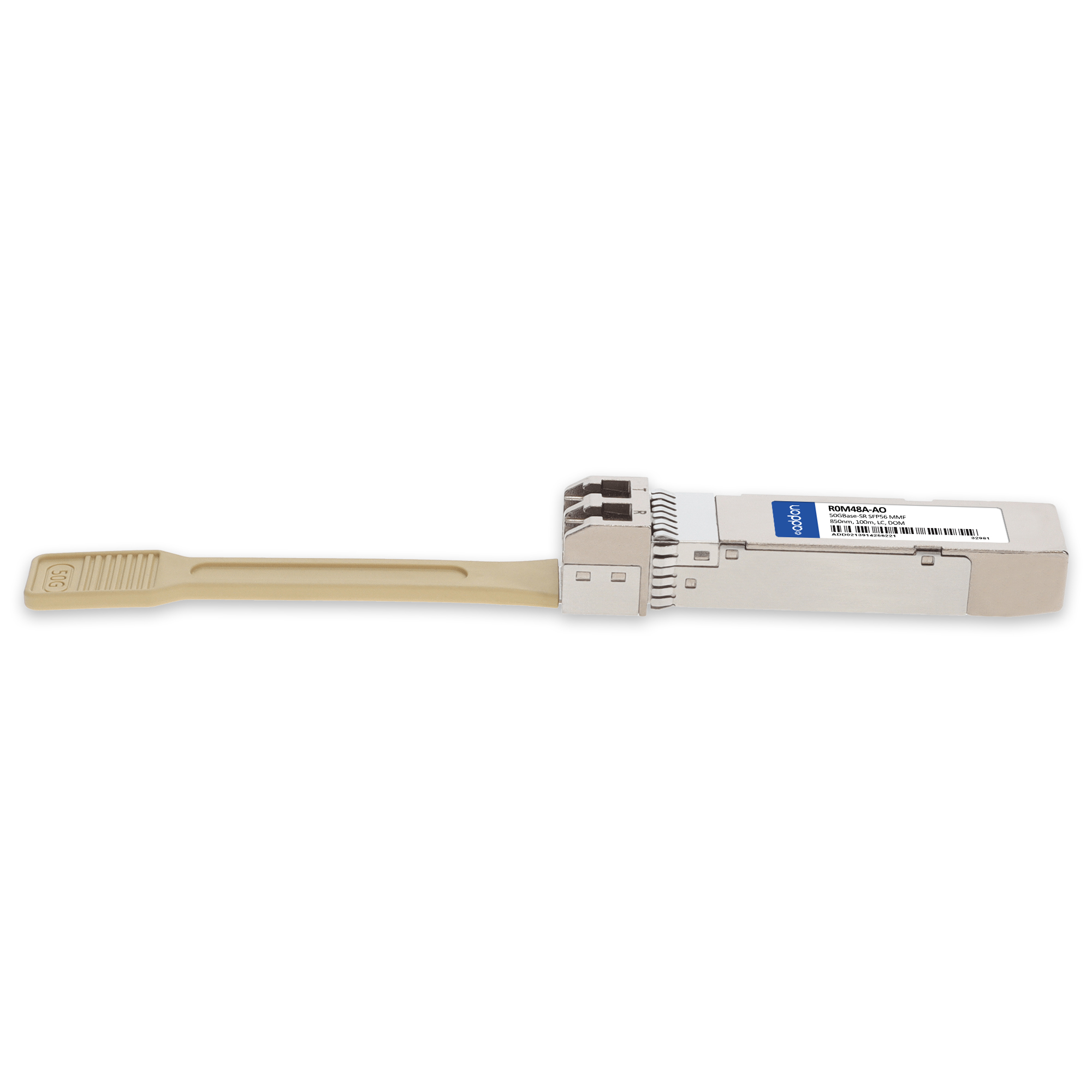 AddOn Networks Aruba Networks R0M48A Compatible TAA 50GBase-SR SFP56 Transceiver (MMF, 850nm, 100m, LC, DOM). SFP transceiver type: Fiber optic, Maximum data transfer rate: 50000 Mbit/s, Interface type: SFP56. Form factor: SFP56, Brand compatibility: Aruba Networks, Compatibility: R0M48A. Compliance certificates: Trade Agreements Act (TAA). Quantity per pack: 1 pc(s). Package width: 70 mm, Package depth: 121 mm, Package height: 30 mm