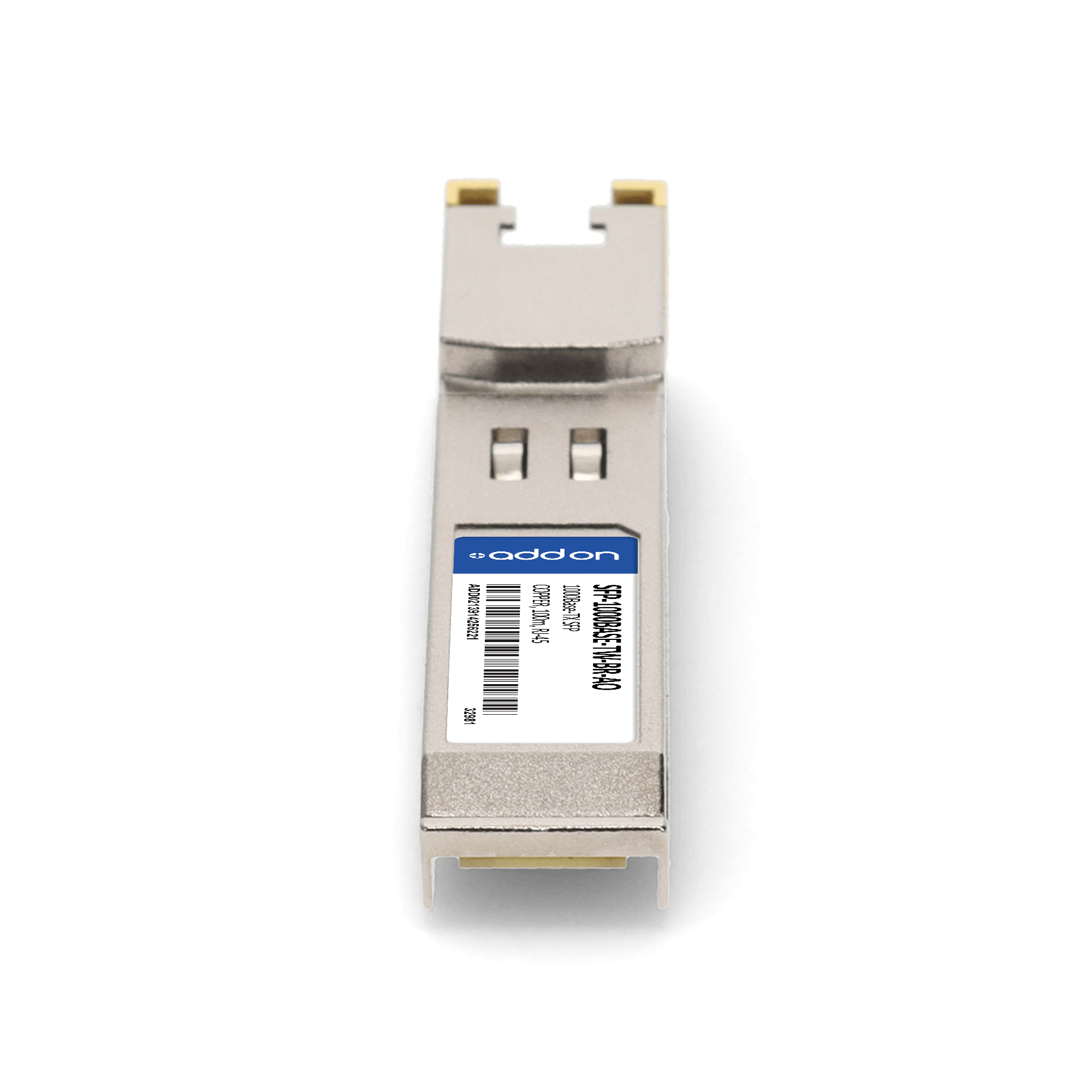 AddOn Networks Brocade Compatible TAA 10/100/1000Base-TX SFP Transceiver (Copper, RJ-45, 100m, SGMII, LOS, Auto Negotiation, Trap Door and Wire Bail). SFP transceiver type: Copper, Maximum data transfer rate: 1000 Mbit/s, Interface type: SFP. Form factor: SFP, Brand compatibility: Brocade. Compliance certificates: Trade Agreements Act (TAA). Quantity per pack: 1 pc(s). Package width: 70 mm, Package depth: 121 mm, Package height: 30 mm