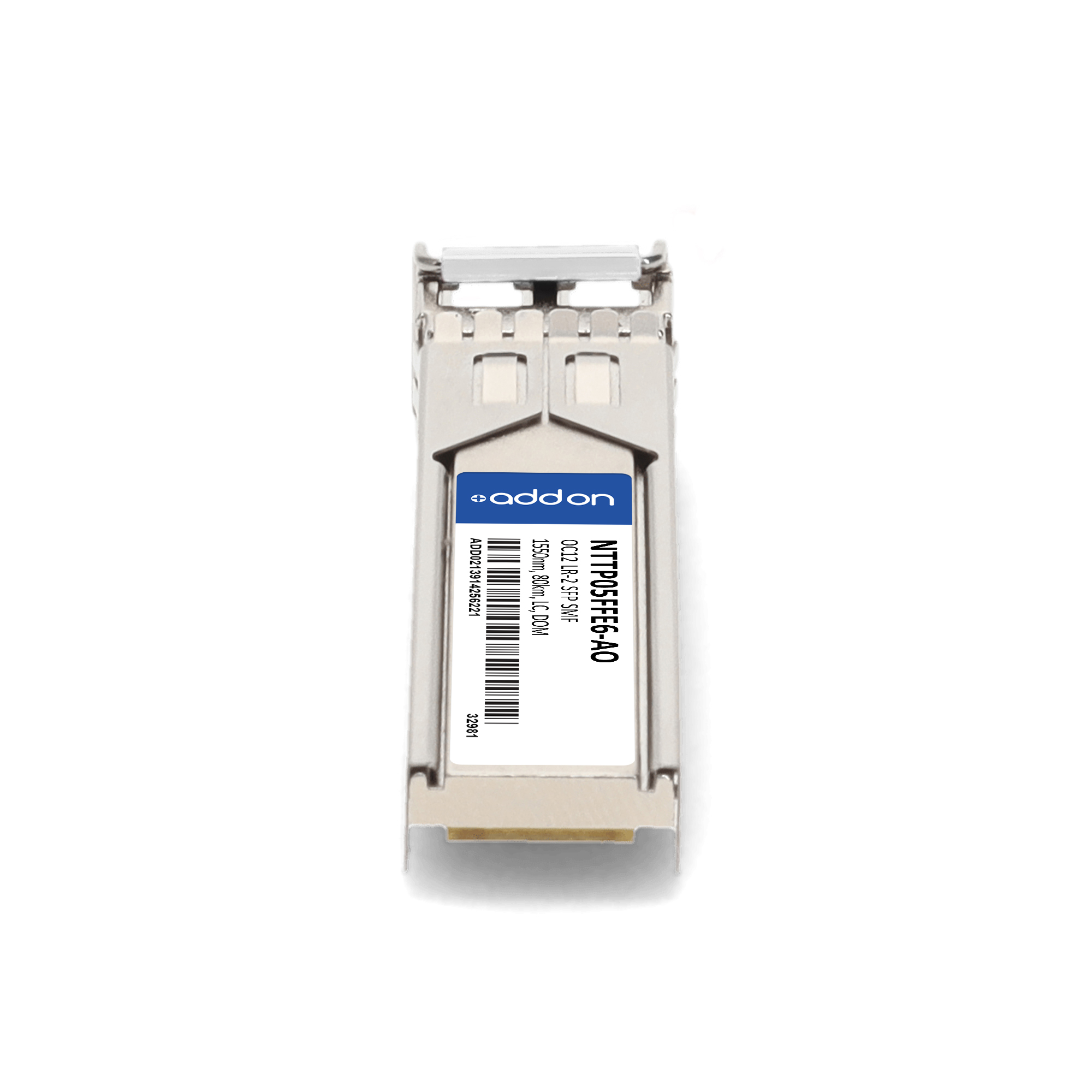 AddOn Networks Ciena NTTP05FFE6 Compatible TAA OC-12-LR2 SFP Transceiver (SMF, 1550nm, 80km, LC, DOM). SFP transceiver type: Fiber optic, Interface type: SFP, Fiber optic connector: LC. Product colour: Silver, Form factor: SFP, Brand compatibility: Ciena. Compliance certificates: Trade Agreements Act (TAA). Quantity per pack: 1 pc(s). Package width: 70 mm, Package depth: 121 mm, Package height: 30 mm