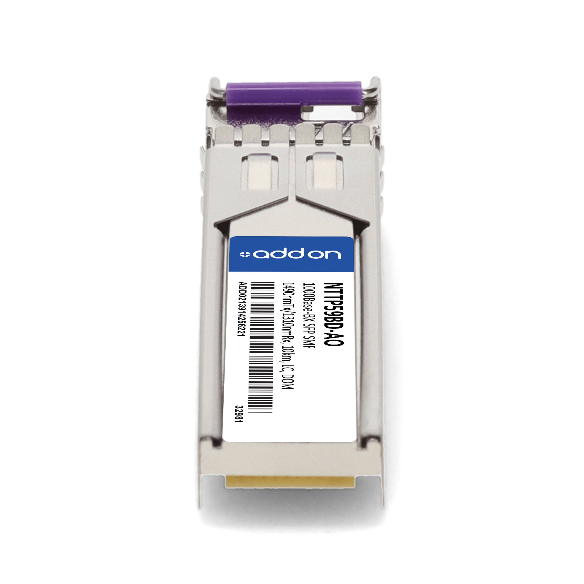 AddOn Networks Ciena NTTP59BD Compatible 1000Base-BX SFP Transceiver (SMF, 1490nmTX/1310nmRX, 10km, LC). SFP transceiver type: Fiber optic, Maximum data transfer rate: 1000 Mbit/s, Interface type: SFP. Form factor: SFP, Brand compatibility: Ciena. Compliance certificates: Trade Agreements Act (TAA). Quantity per pack: 1 pc(s). Package width: 70 mm, Package depth: 121 mm, Package height: 30 mm