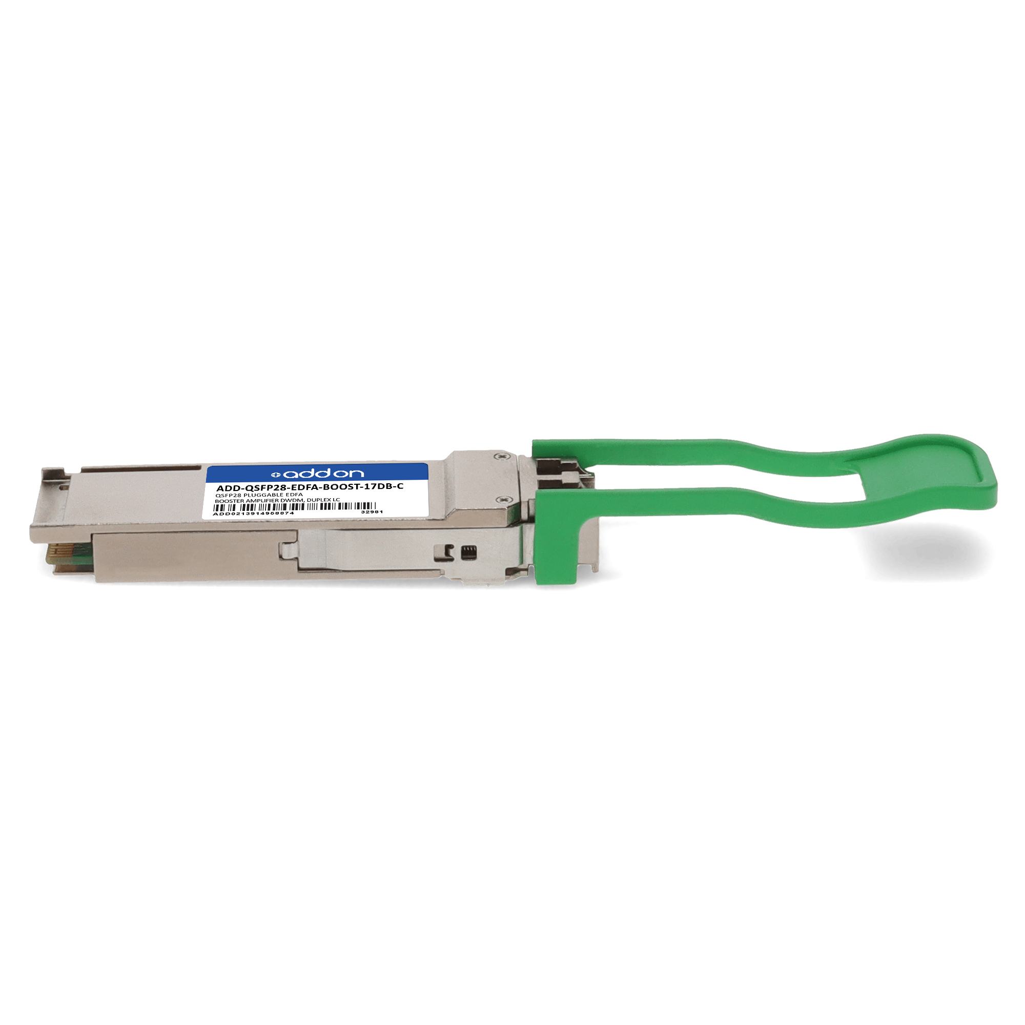AddOn Networks Cisco Compatible QSFP28 Pluggable EDFA Booster amplifier for DWDM, Duplex LC, Input power -20dBm to 0dBm, Nominal gain +17dB. SFP transceiver type: Fiber optic, Interface type: QSFP28, Fiber optic connector: LC. Product colour: Silver, Form factor: QSFP28, Brand compatibility: Cisco. Quantity per pack: 1 pc(s). Harmonized System (HS) code: 85176200, 8517.62.0090 |