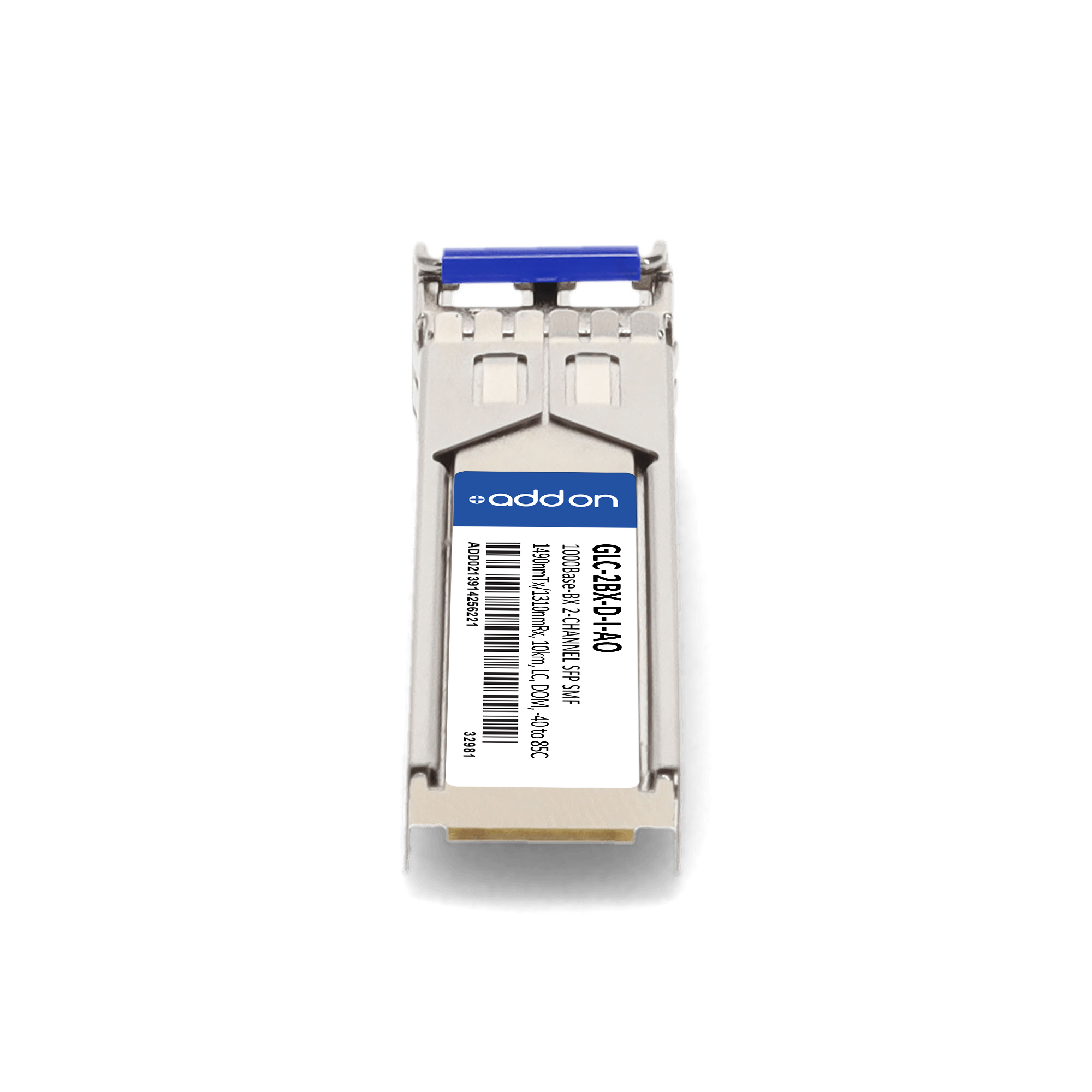 AddOn Networks Cisco GLC-2BX-D-I Compatible TAA 1000Base-BX 2-Channel SFP Transceiver (SMF, 1490nmTx/1310nmRx, 10km, LC, DOM, -40 to 85C). SFP transceiver type: Fiber optic, Maximum data transfer rate: 1000 Mbit/s, Interface type: SFP. Form factor: SFP, Brand compatibility: Cisco, Compatibility: GLC-2BX-D-I. Compliance certificates: Trade Agreements Act (TAA). Quantity per pack: 1 pc(s). Package width: 70 mm, Package depth: 121 mm, Package height: 30 mm