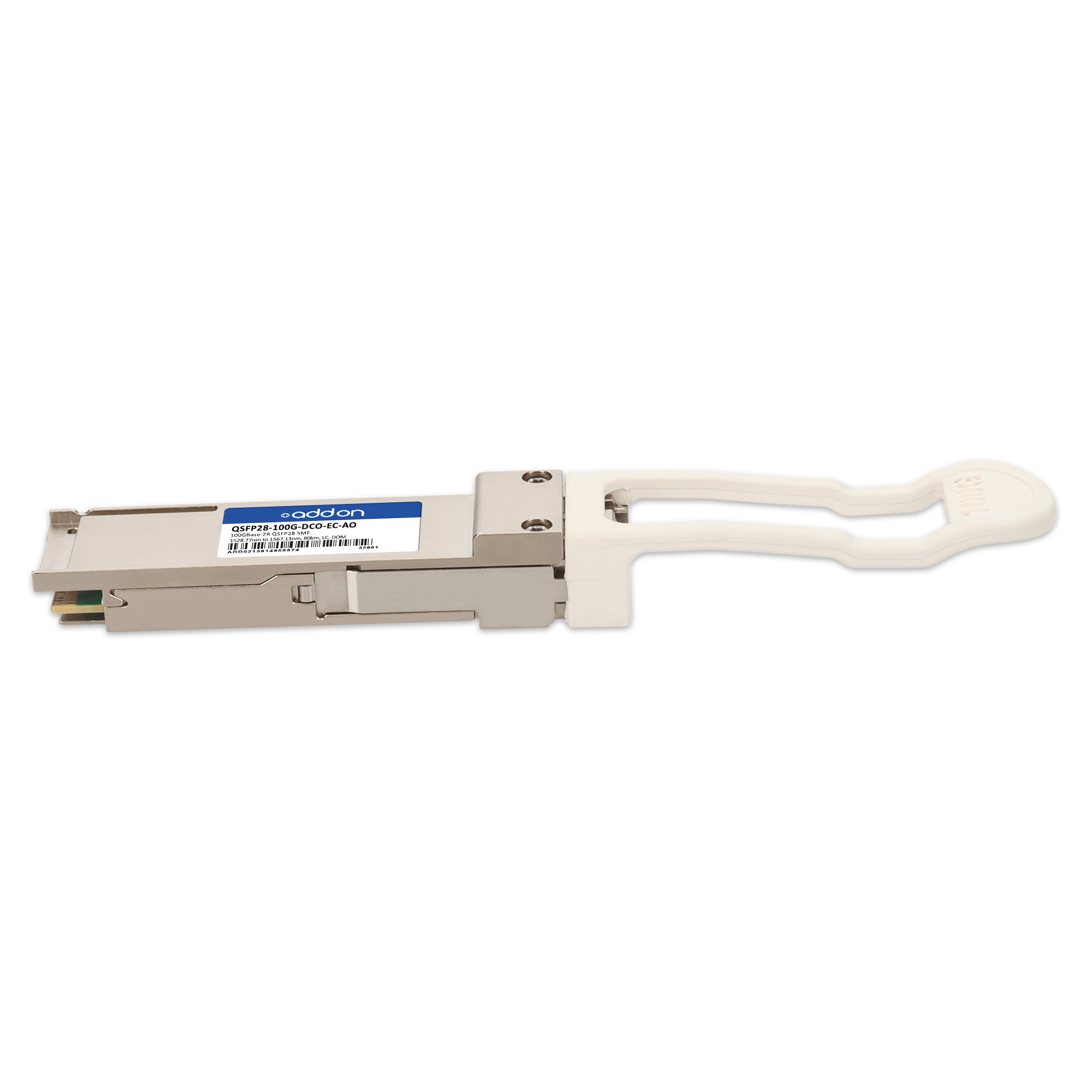 AddOn Networks Edge-corE Compatible (with select systems) TAA 100GBase-ZR QSFP28 Transceiver (SMF, 1528.77nm to 1567.13nm, 80km, LC, DOM). SFP transceiver type: Fiber optic, Maximum data transfer rate: 100000 Mbit/s, Interface type: QSFP28. Form factor: QSFP28, Brand compatibility: Edgecore Networks. Compliance certificates: Trade Agreements Act (TAA). Quantity per pack: 1 pc(s). Package width: 70 mm, Package depth: 121 mm, Package height: 30 mm