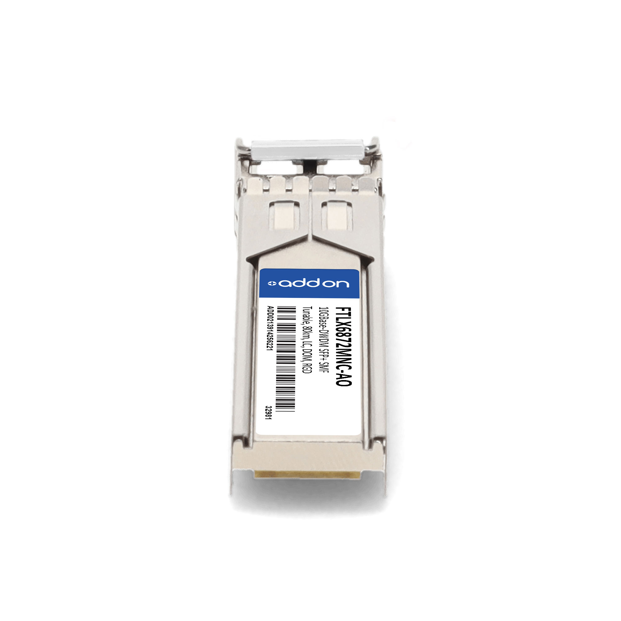 AddOn Networks Finisar Compatible TAA 10GBase-DWDM 50GHz SFP+ Transceiver (SMF, Tunable, 80km, LC, DOM, -40 to 85C). SFP transceiver type: Fiber optic, Maximum data transfer rate: 10000 Mbit/s, Interface type: SFP+. Form factor: SFP+, Brand compatibility: Finisar. Compliance certificates: Trade Agreements Act (TAA). Quantity per pack: 1 pc(s). Package width: 70 mm, Package depth: 121 mm, Package height: 30 mm
