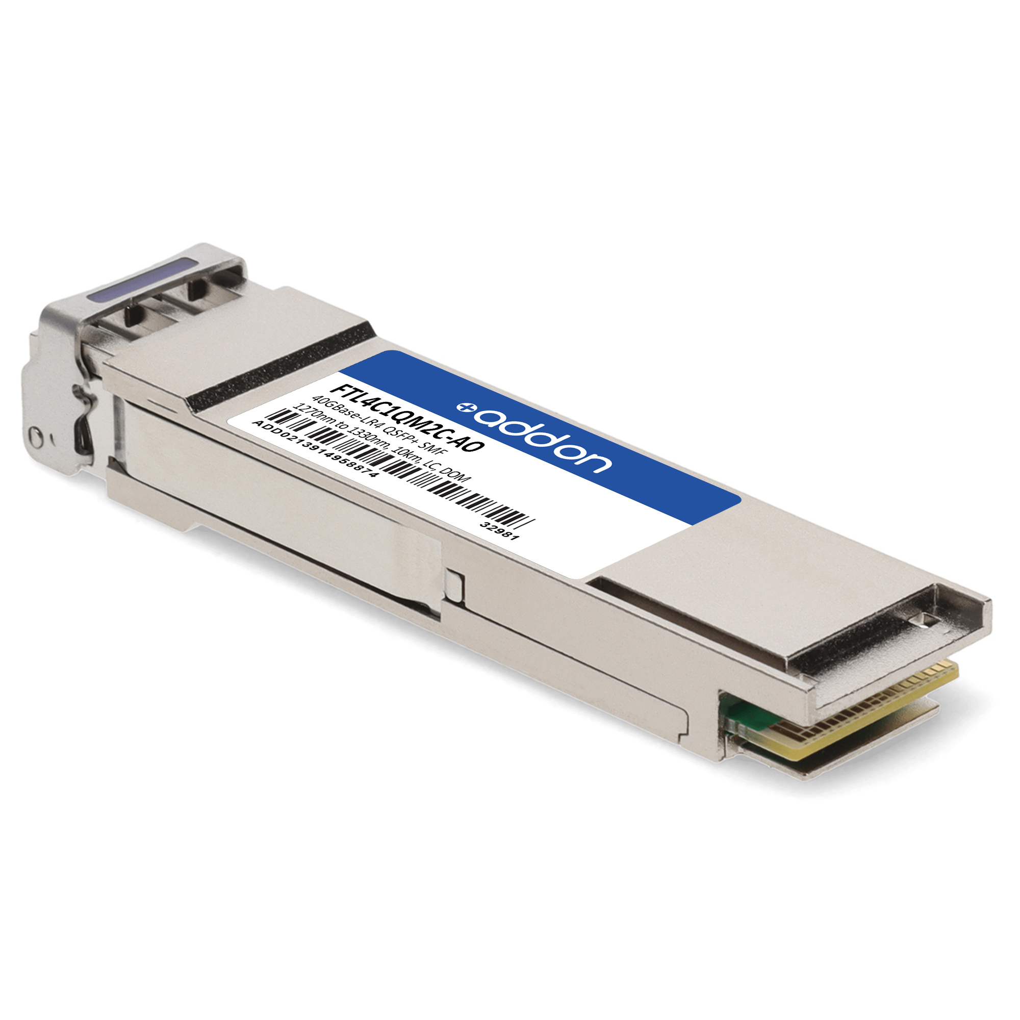AddOn Networks Finisar FTL4C1QM2C Compatible TAA 40GBase-LR4 QSFP+ Transceiver (SMF, 1270nm to 1330nm, 10km, LC, DOM). SFP transceiver type: Fiber optic, Maximum data transfer rate: 40000 Mbit/s, Interface type: QSFP+. Form factor: QSFP+, Brand compatibility: Finisar. Compliance certificates: Trade Agreements Act (TAA). Quantity per pack: 1 pc(s). Package width: 70 mm, Package depth: 121 mm, Package height: 30 mm
