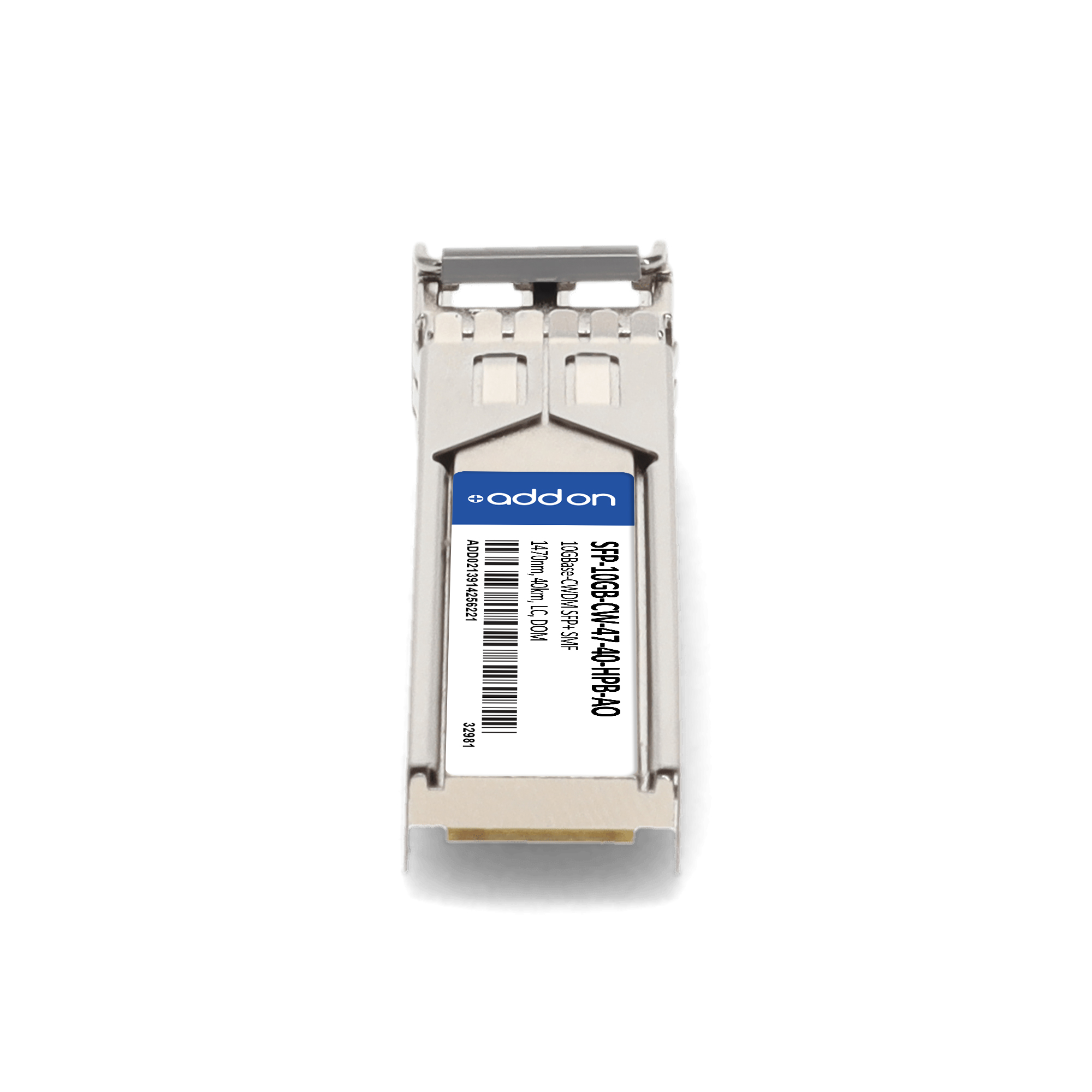 AddOn Networks HP Compatible TAA 10GBase-CWDM SFP+ Transceiver (SMF, 1470nm, 40km, LC, DOM). SFP transceiver type: Fiber optic, Maximum data transfer rate: 10000 Mbit/s, Interface type: SFP+. Form factor: SFP+, Brand compatibility: HP. Compliance certificates: Trade Agreements Act (TAA). Quantity per pack: 1 pc(s). Package width: 70 mm, Package depth: 121 mm, Package height: 30 mm