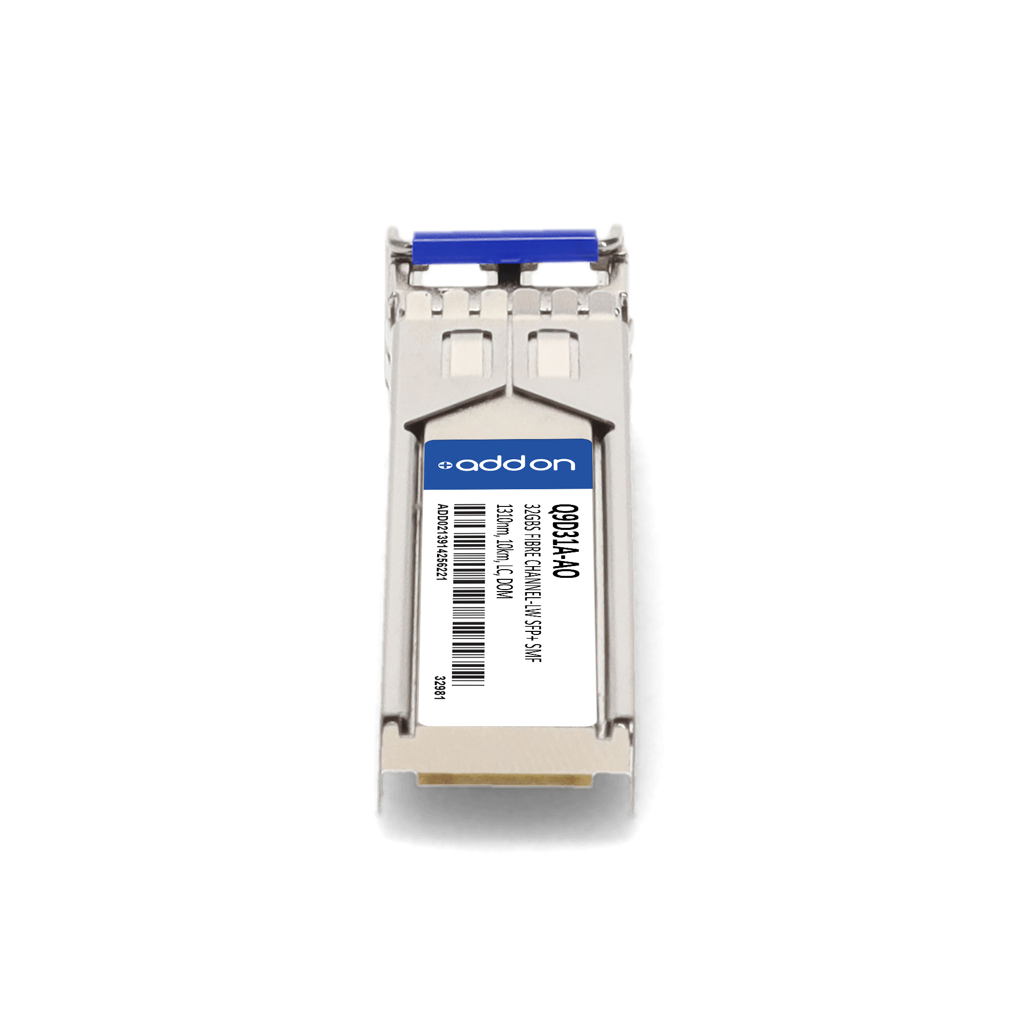 AddOn Networks HP Q9D31A Compatible TAA 32GBase-LW Fibre Channel SFP+ Transceiver (SMF, 1310nm, 10km, LC, DOM). SFP transceiver type: Fiber optic, Maximum data transfer rate: 32000 Mbit/s, Interface type: SFP+. Form factor: SFP+, Brand compatibility: HP, Compatibility: Q9D31A. Compliance certificates: Trade Agreements Act (TAA). Quantity per pack: 1 pc(s). Package width: 70 mm, Package depth: 121 mm, Package height: 30 mm