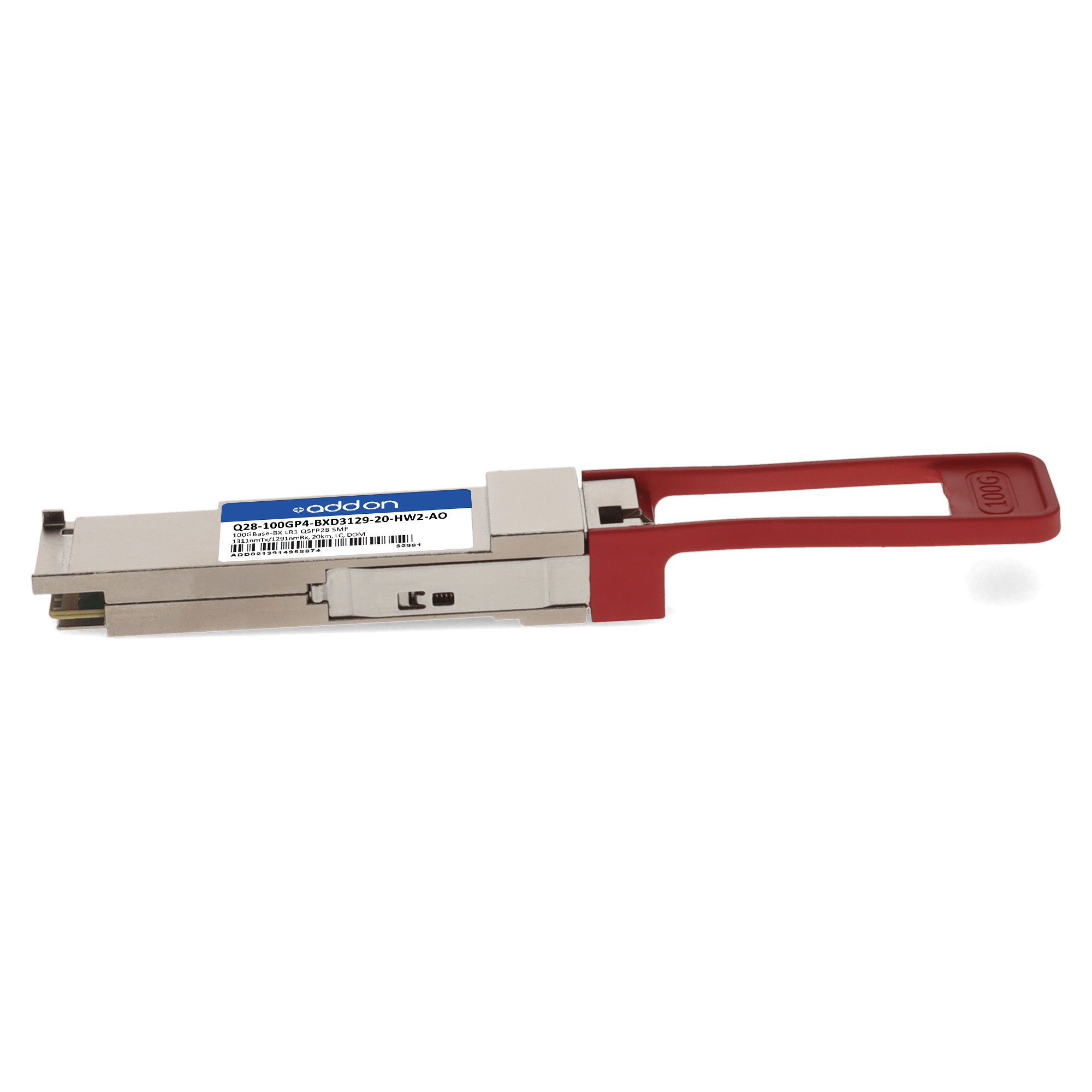 AddOn Networks Huawei Compatible TAA 100GBase-BX LR1 PAM4 QSFP28 Transceiver Single Lambda (SMF, 1311nmTx/1291nmRx, 20km, LC, DOM). SFP transceiver type: Fiber optic, Maximum data transfer rate: 100000 Mbit/s, Interface type: QSFP28. Form factor: QSFP28, Brand compatibility: Huawei. Compliance certificates: Trade Agreements Act (TAA). Quantity per pack: 1 pc(s). Package width: 70 mm, Package depth: 121 mm, Package height: 30 mm