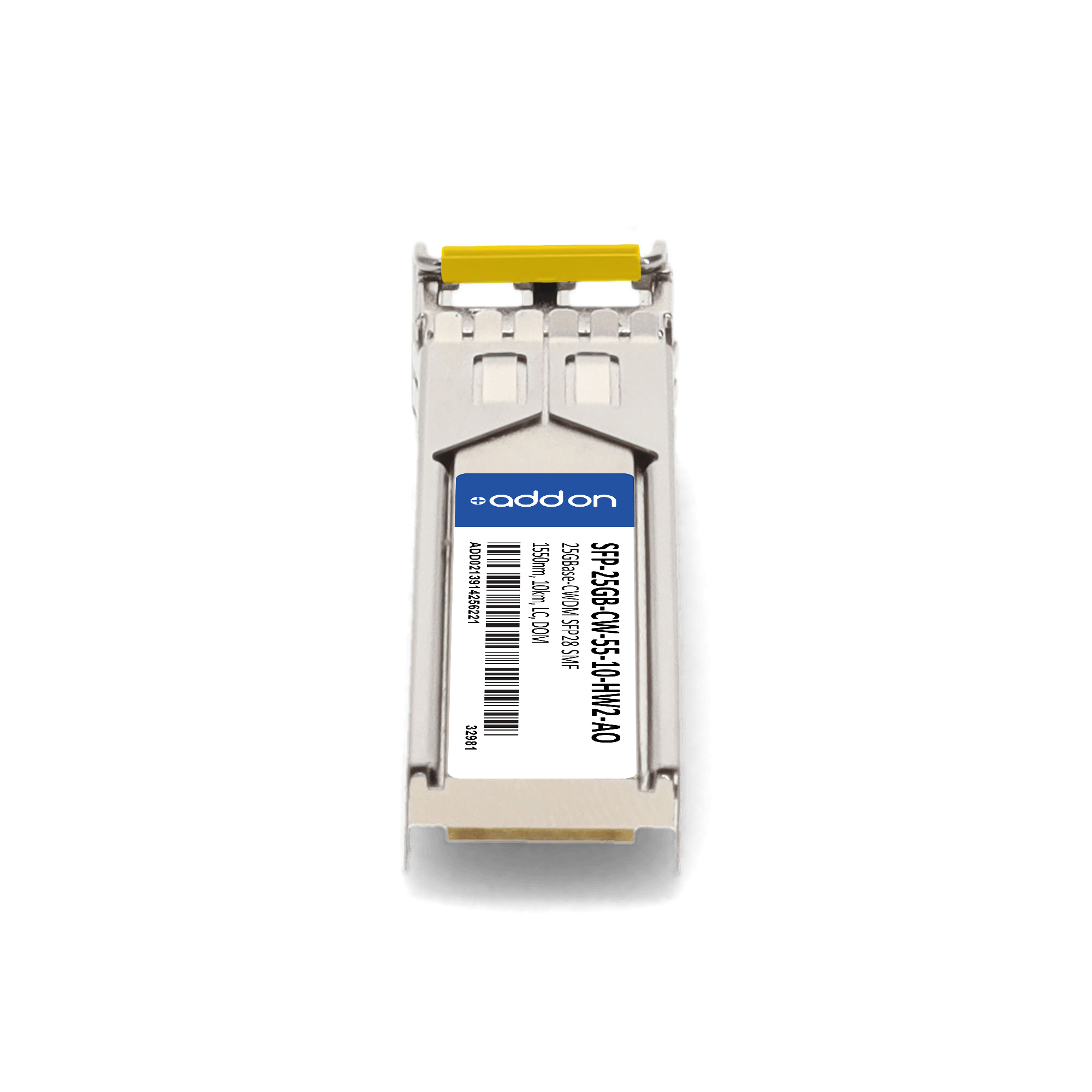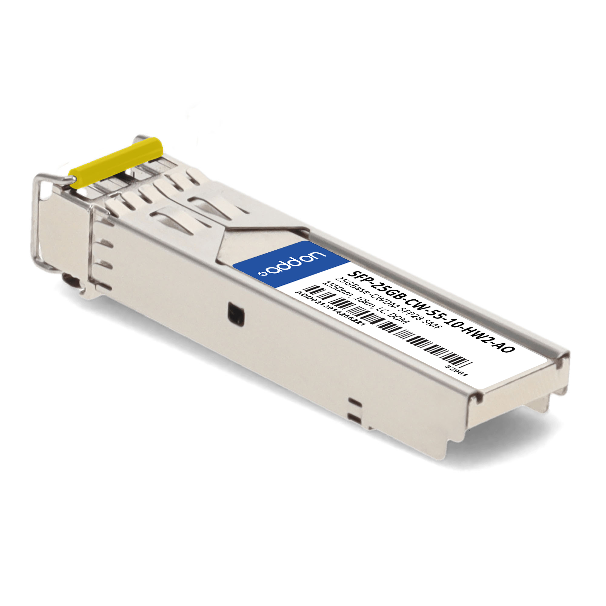 AddOn Networks Huawei Compatible TAA 25GBase-CWDM SFP28 Transceiver (SMF, 1550nm, 10km, LC, DOM). SFP transceiver type: Fiber optic, Maximum data transfer rate: 25000 Mbit/s, Interface type: SFP28. Product colour: Silver, Form factor: SFP28, Brand compatibility: Huawei. Compliance certificates: Trade Agreements Act (TAA). Quantity per pack: 1 pc(s). Package width: 70 mm, Package depth: 121 mm, Package height: 30 mm