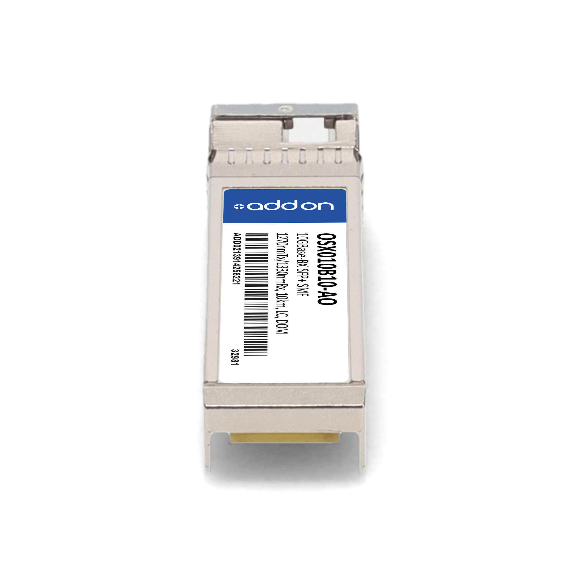 AddOn Networks Huawei OSX010B10 Compatible TAA Compliant 10GBase-BX SFP+ Transceiver (SMF, 1270nmTx/1330nmRx, 10km, LC, DOM). SFP transceiver type: Fiber optic, Maximum data transfer rate: 10000 Mbit/s, Interface type: SFP+. Form factor: SFP+, Brand compatibility: Huawei. Compliance certificates: Trade Agreements Act (TAA). Quantity per pack: 1 pc(s). Package width: 70 mm, Package depth: 121 mm, Package height: 30 mm