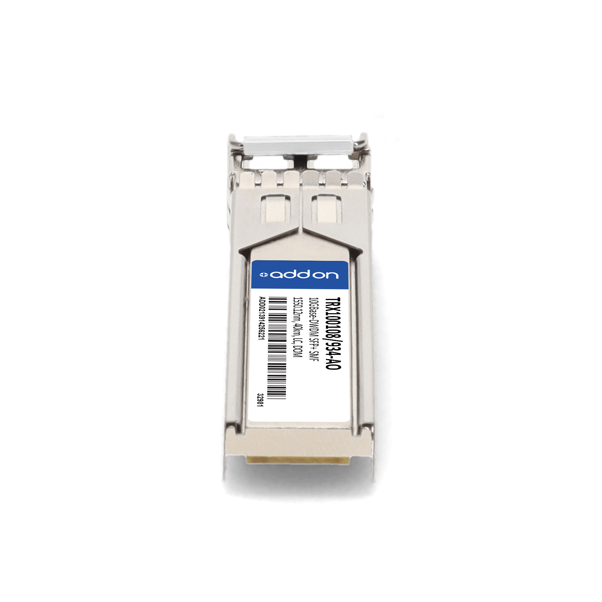 AddOn Networks Infinera TRX100108/934 Compatible TAA 10GBase-DWDM SFP+ Transceiver C-Band 100GHz (SMF, 1550.12nm, 40km, LC, DOM). SFP transceiver type: Fiber optic, Maximum data transfer rate: 10000 Mbit/s, Interface type: SFP+. Product colour: Silver, Form factor: SFP+, Brand compatibility: Infinera Corporation. Compliance certificates: Trade Agreements Act (TAA). Quantity per pack: 1 pc(s). Package width: 70 mm, Package depth: 121 mm, Package height: 30 mm