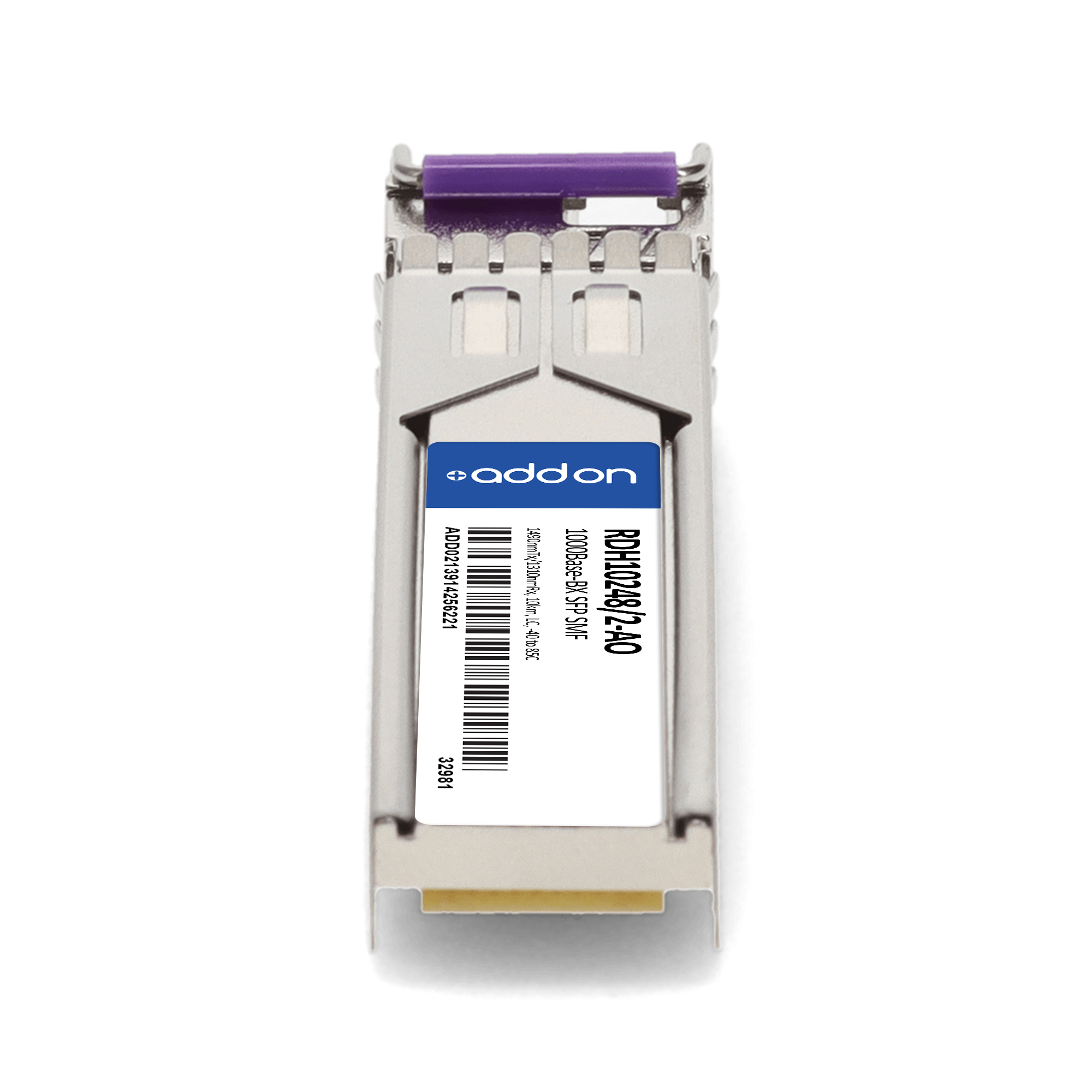 AddOn Networks LG-Ericsson RDH10248/2 Compatible TAA 1000Base-BX SFP Transceiver (SMF, 1490nmTx/1310nmRx, 10km, LC, -40 to 85C). SFP transceiver type: Fiber optic, Maximum data transfer rate: 1000 Mbit/s, Interface type: SFP. Form factor: SFP, Brand compatibility: LG-Ericsson, Compatibility: RDH10248/2. Compliance certificates: Trade Agreements Act (TAA). Quantity per pack: 1 pc(s). Package width: 70 mm, Package depth: 121 mm, Package height: 30 mm