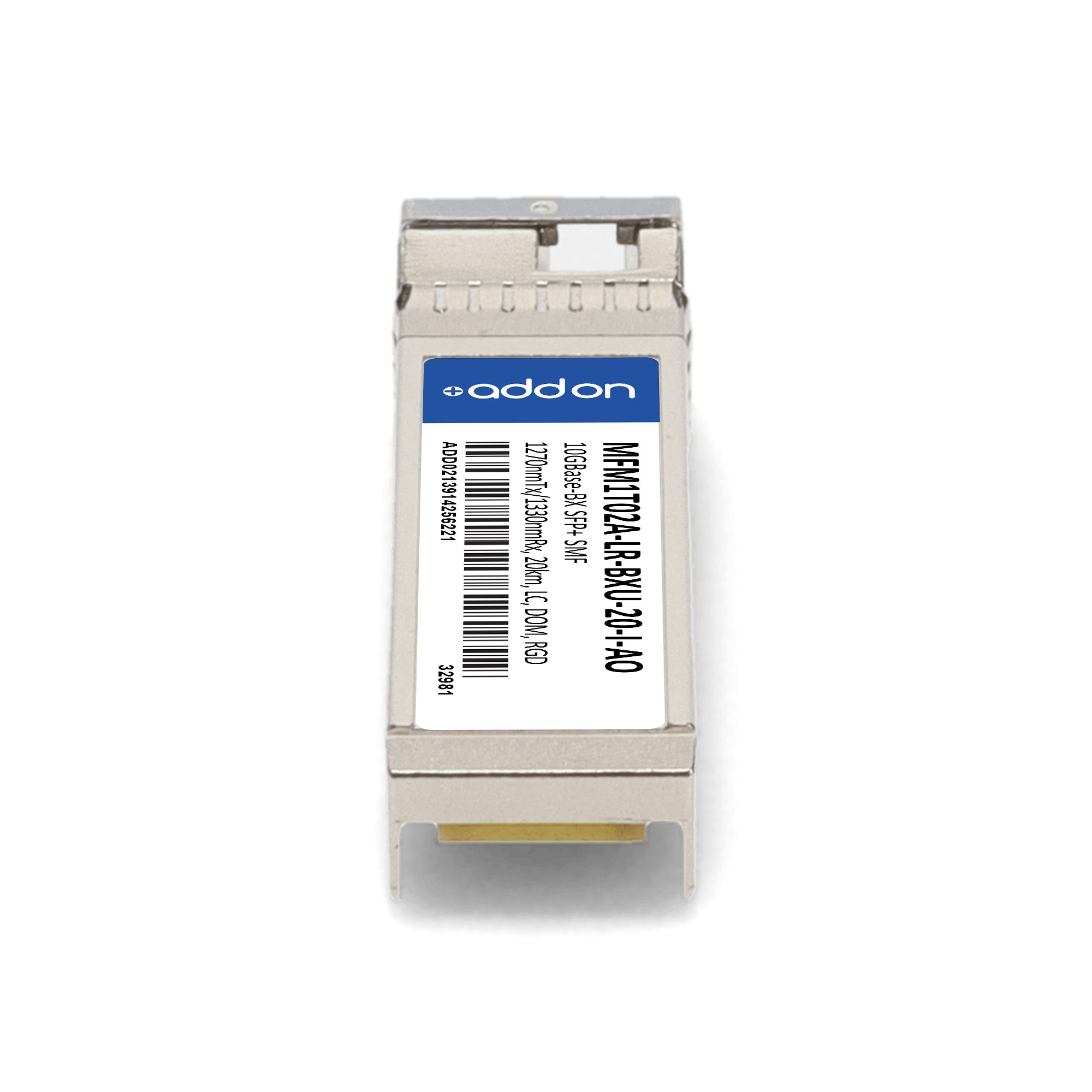 AddOn Networks Mellanox MFM1T02A-LR-BXU-20-I Compatible TAA 10GBase-BX SFP+ Transceiver (SMF, 1270nmTx/1330nmRx, 20km, LC, DOM, -40 to 85C). SFP transceiver type: Fiber optic, Maximum data transfer rate: 10000 Mbit/s, Interface type: SFP+. Product colour: Silver, Form factor: SFP+, Brand compatibility: Mellanox. Compliance certificates: Trade Agreements Act (TAA). Quantity per pack: 1 pc(s). Package width: 70 mm, Package depth: 121 mm, Package height: 30 mm