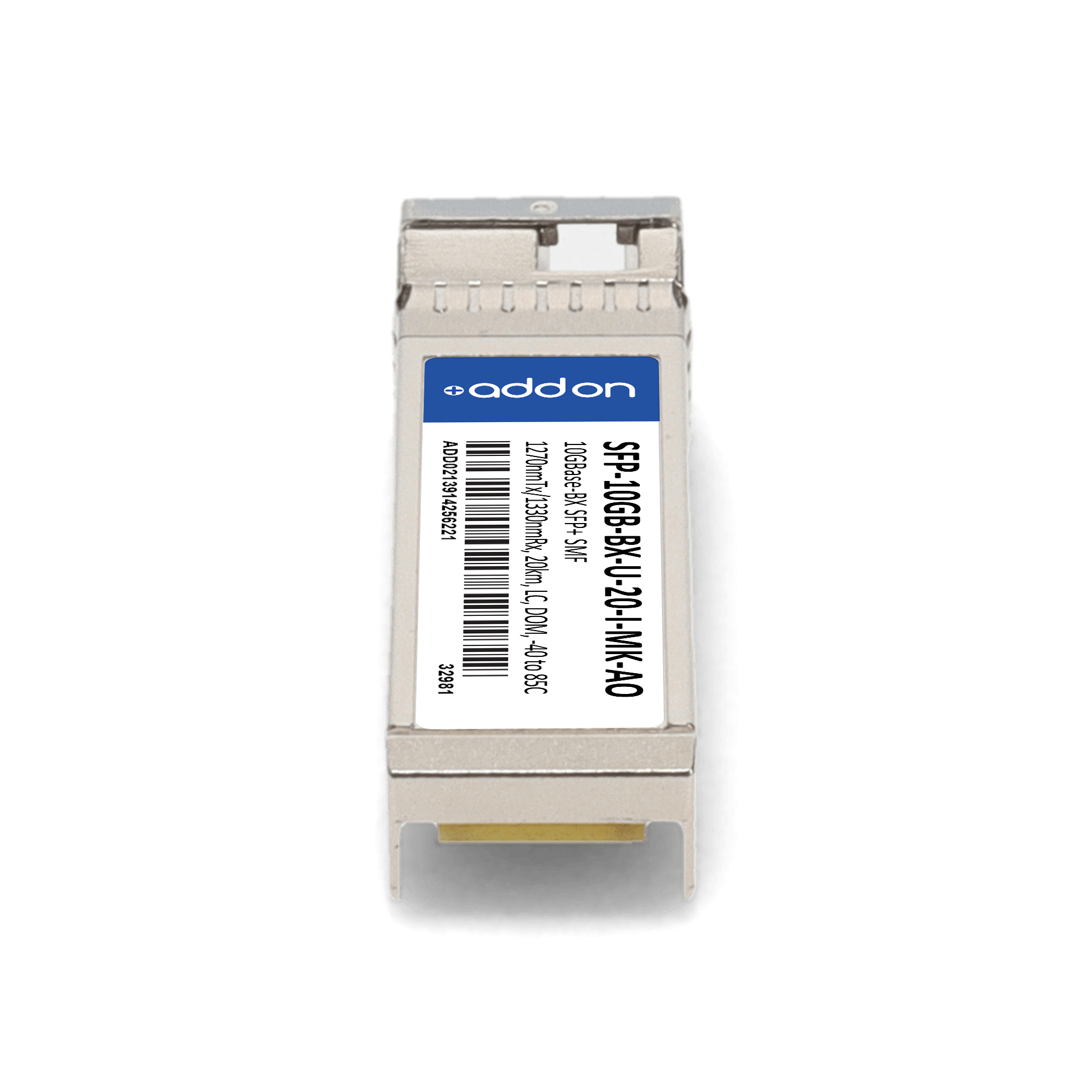 AddOn Networks Mikrotik Compatible TAA 10GBase-BX SFP+ Transceiver (SMF, 1270nmTx/1330nmRx, 20km, LC, DOM, -40 to 85C). SFP transceiver type: Fiber optic, Maximum data transfer rate: 10000 Mbit/s, Interface type: SFP+. Form factor: SFP+, Brand compatibility: MikroTik. Compliance certificates: Trade Agreements Act (TAA). Quantity per pack: 1 pc(s). Package width: 70 mm, Package depth: 121 mm, Package height: 30 mm