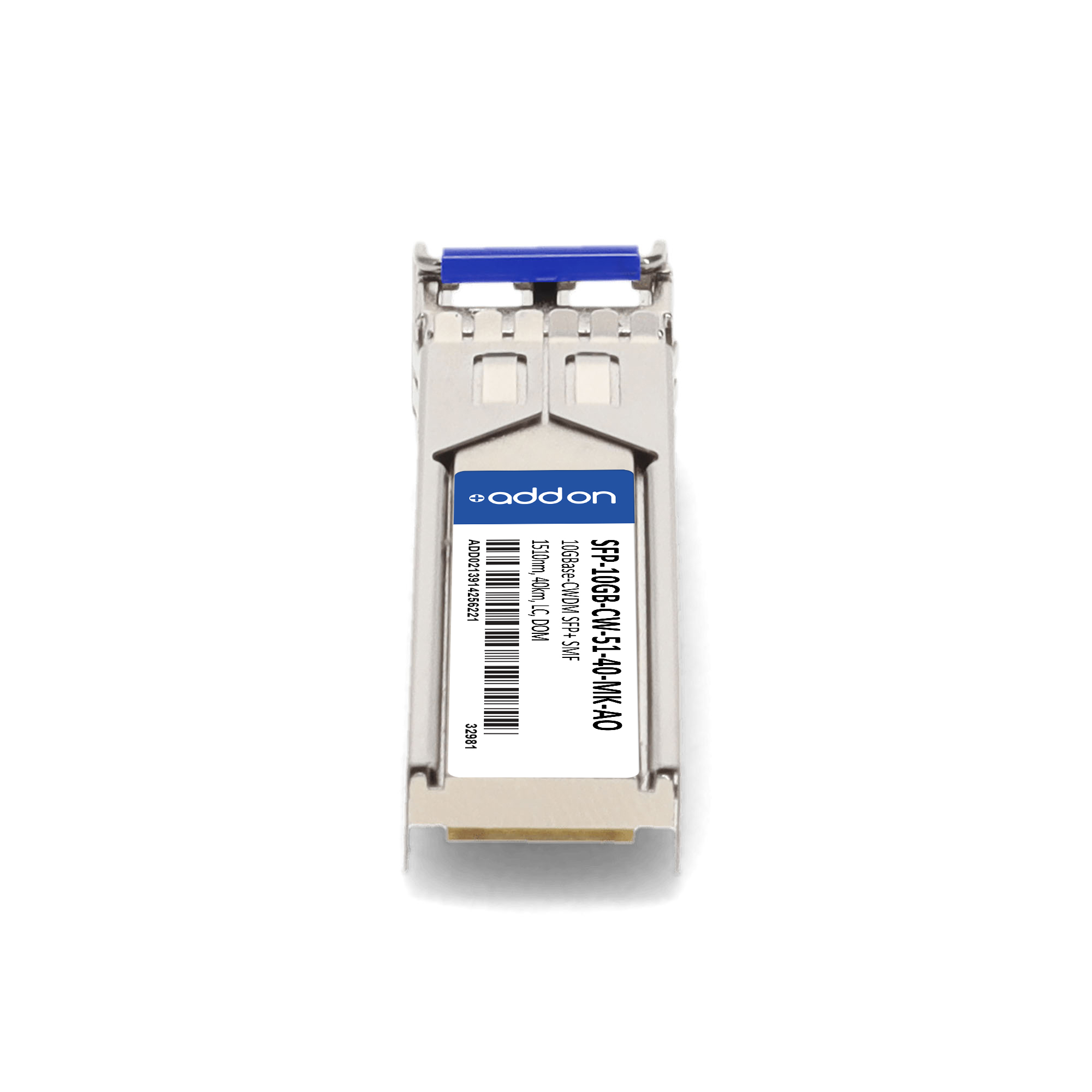 AddOn Networks Mikrotik Compatible TAA 10GBase-CWDM SFP+ Transceiver (SMF, 1510nm, 40km, LC, DOM). SFP transceiver type: Fiber optic, Maximum data transfer rate: 10000 Mbit/s, Interface type: SFP+. Form factor: SFP+, Brand compatibility: MikroTik. Compliance certificates: Trade Agreements Act (TAA). Quantity per pack: 1 pc(s). Package width: 70 mm, Package depth: 121 mm, Package height: 30 mm