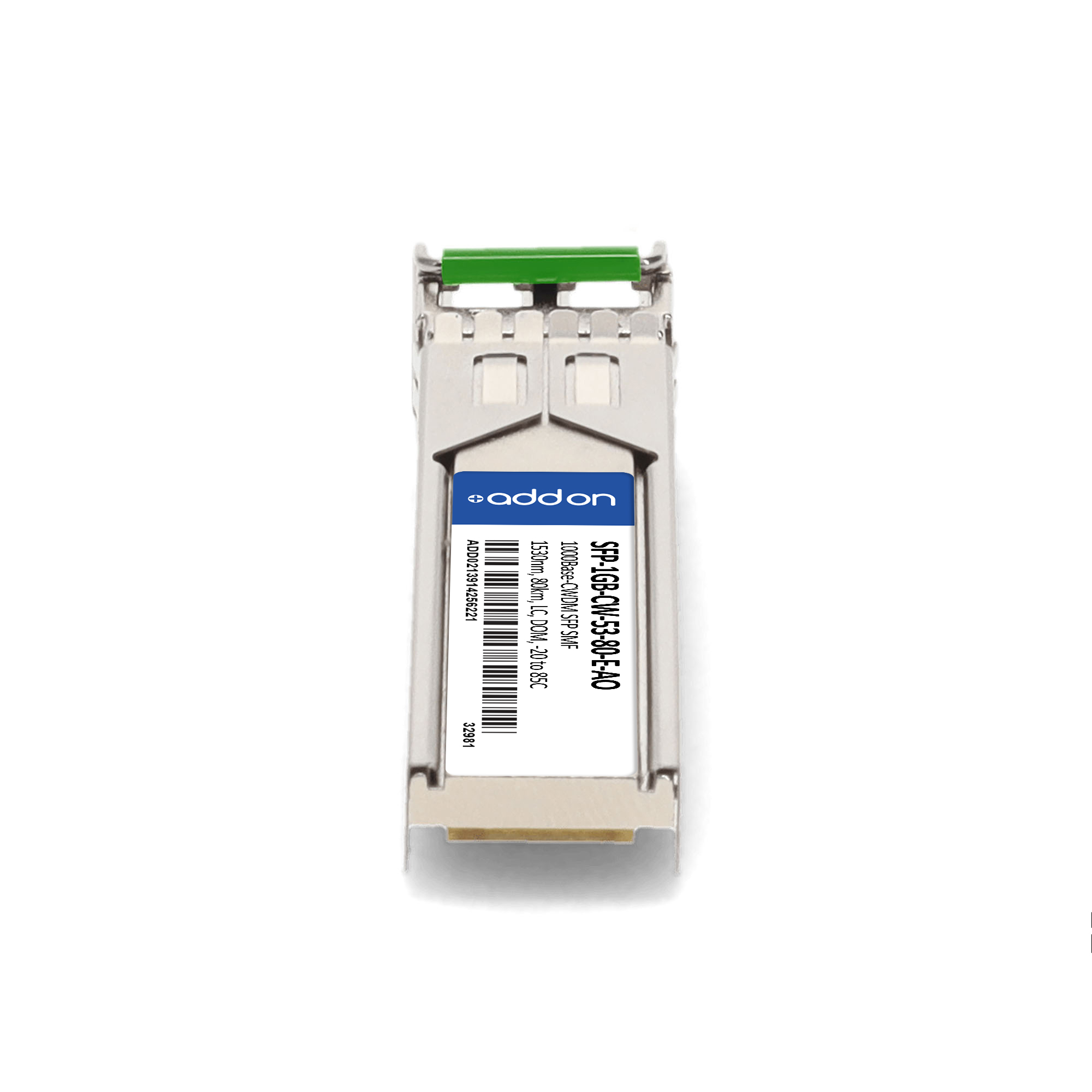 AddOn Networks MSA and TAA 1000Base-CWDM SFP Transceiver (SMF, 1530nm, 80km, LC, DOM, -20 to 85C). SFP transceiver type: Fiber optic, Maximum data transfer rate: 1000 Mbit/s, Interface type: SFP. Product colour: Silver, Form factor: SFP, Brand compatibility: MSA Compliant. Compliance certificates: Trade Agreements Act (TAA). Quantity per pack: 1 pc(s). Package width: 70 mm, Package depth: 121 mm, Package height: 30 mm