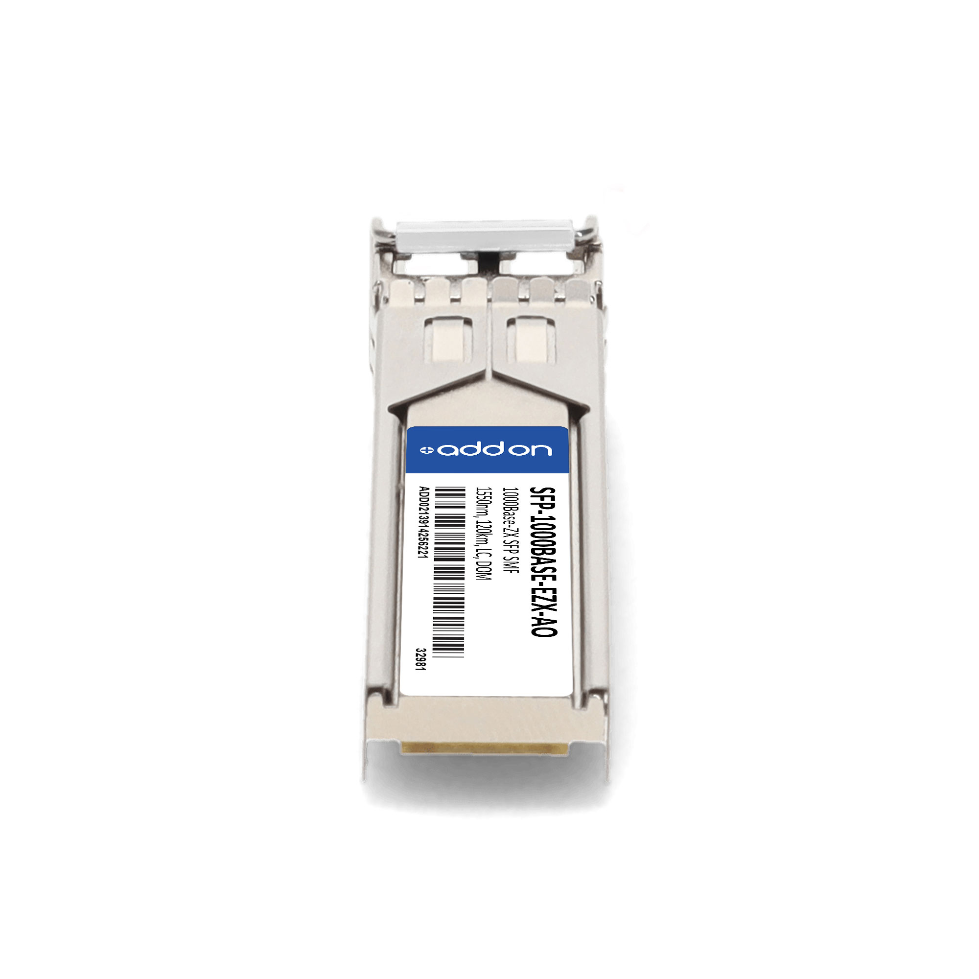AddOn Networks MSA and TAA 1000Base-ZX SFP Transceiver (SMF, 1550nm, 120km, LC, DOM). SFP transceiver type: Fiber optic, Maximum data transfer rate: 1000 Mbit/s, Interface type: SFP. Form factor: SFP, Brand compatibility: MSA Compliant. Compliance certificates: Trade Agreements Act (TAA), Certification: TAA. Width: 69.8 mm, Depth: 120.7 mm, Height: 30.5 mm. Quantity per pack: 1 pc(s)