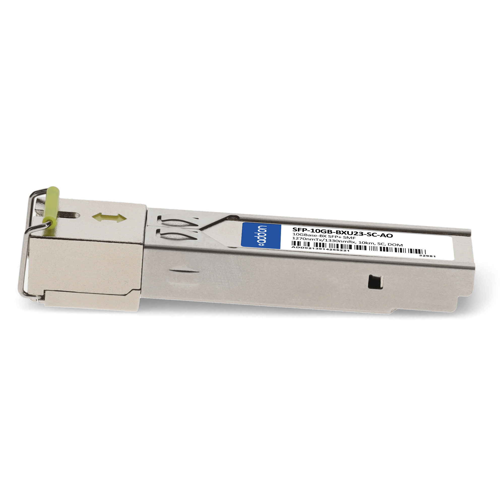 AddOn Networks MSA and TAA 10GBase-BX SFP+ Transceiver (SMF, 1270nmTx/1330nmRx, 10km, SC, DOM). SFP transceiver type: Fiber optic, Maximum data transfer rate: 10000 Mbit/s, Interface type: SFP+. Form factor: SFP+, Brand compatibility: MSA Compliant. Compliance certificates: Trade Agreements Act (TAA). Quantity per pack: 1 pc(s). Package width: 70 mm, Package depth: 121 mm, Package height: 30 mm
