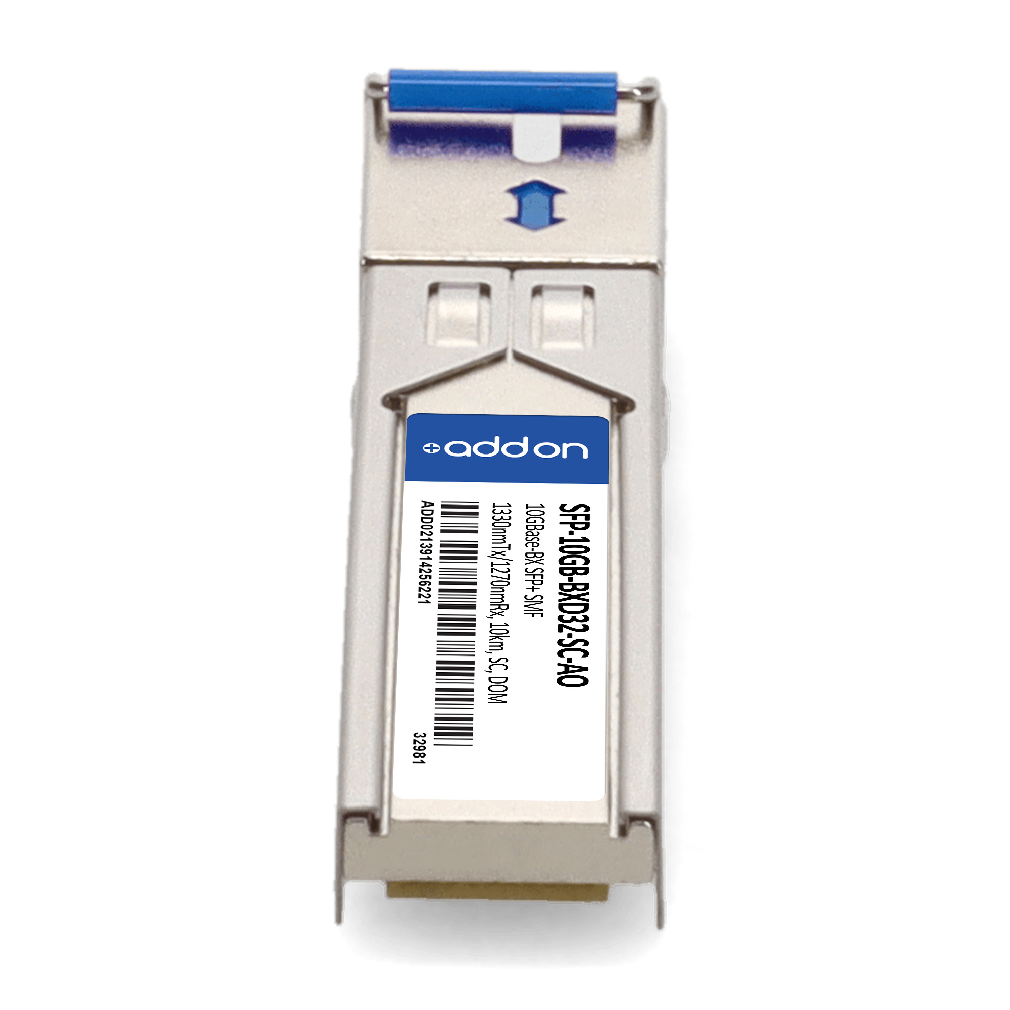 AddOn Networks MSA and TAA 10GBase-BX SFP+ Transceiver (SMF, 1330nmTx/1270nmRx, 10km, SC, DOM). SFP transceiver type: Fiber optic, Maximum data transfer rate: 10000 Mbit/s, Interface type: SFP+. Form factor: SFP+, Brand compatibility: MSA Compliant. Compliance certificates: Trade Agreements Act (TAA). Quantity per pack: 1 pc(s). Package width: 70 mm, Package depth: 121 mm, Package height: 30 mm