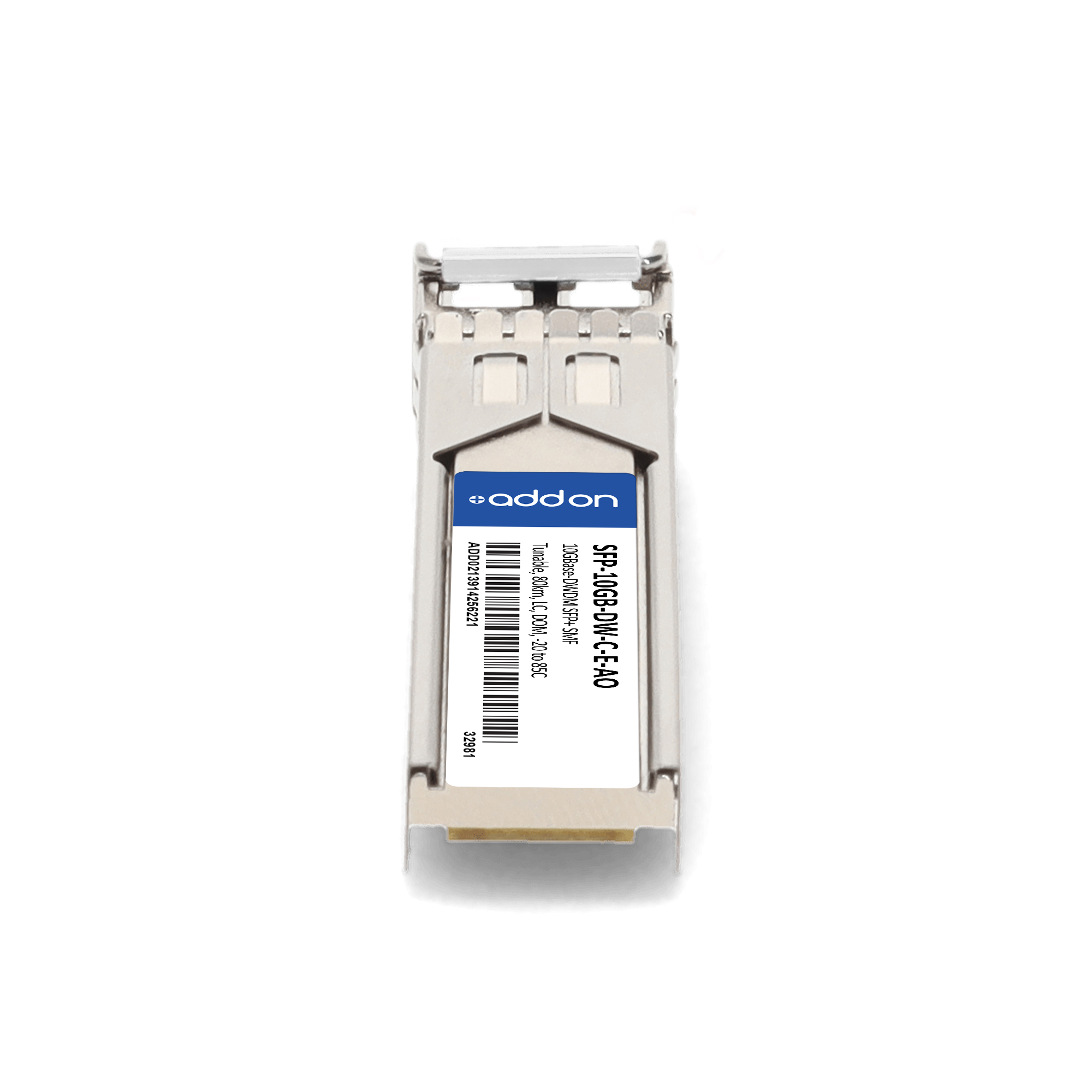 AddOn Networks MSA and TAA 10GBase-DWDM 100GHz SFP+ Transceiver (SMF, Tunable, 80km, LC, DOM, -20 to 85C). SFP transceiver type: Fiber optic, Maximum data transfer rate: 10000 Mbit/s, Interface type: SFP+. Product colour: Silver, Form factor: SFP+, Brand compatibility: MSA Compliant. Compliance certificates: Trade Agreements Act (TAA). Quantity per pack: 1 pc(s). Package width: 70 mm, Package depth: 121 mm, Package height: 30 mm