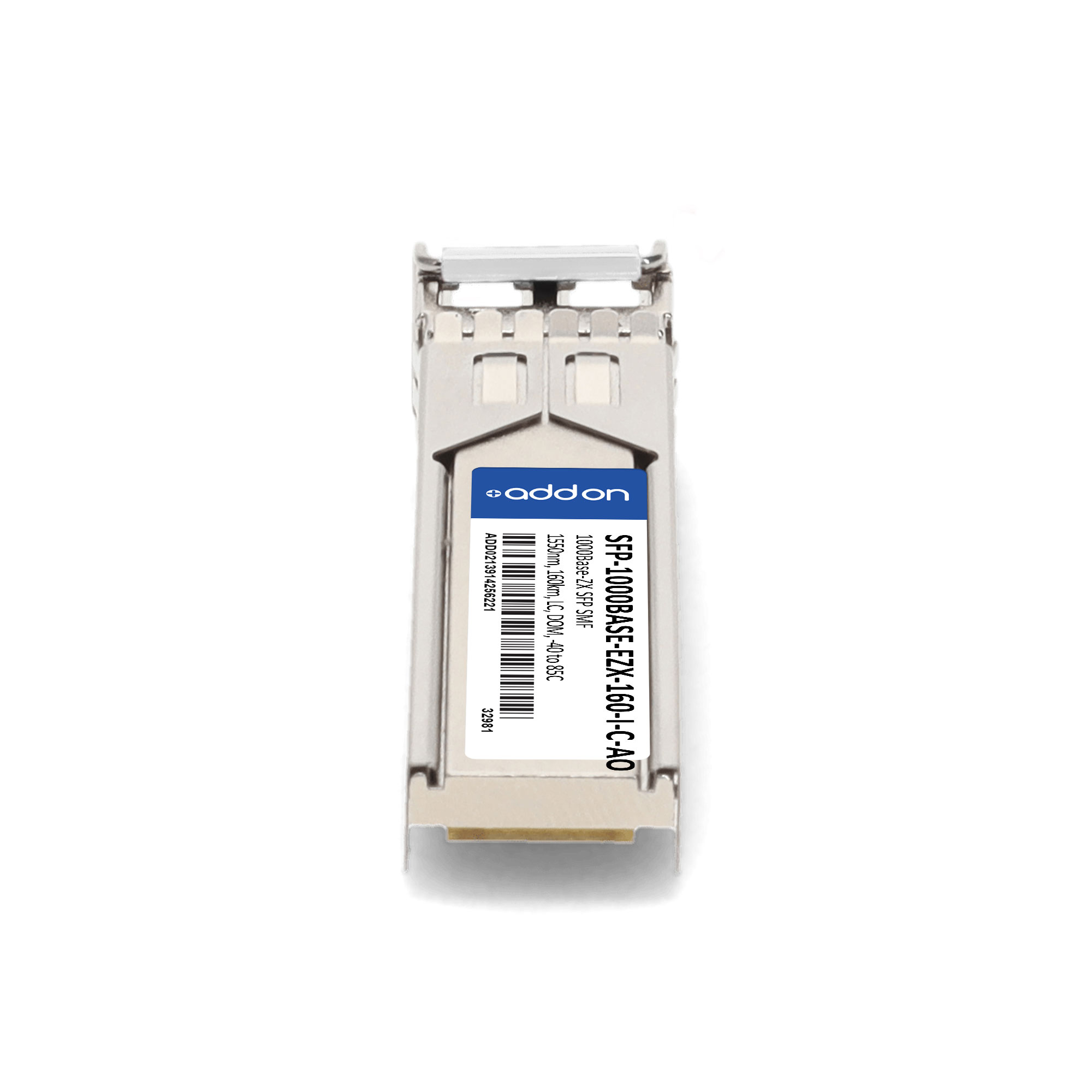 AddOn Networks SFP-1000BASE-EZX-160-I-C-AO. SFP transceiver type: Fiber optic, Maximum data transfer rate: 1000 Mbit/s, Interface type: SFP. Form factor: SFP, Brand compatibility: Cisco. Compliance certificates: Trade Agreements Act (TAA). Quantity per pack: 1 pc(s). Country of origin: United Kingdom, United States