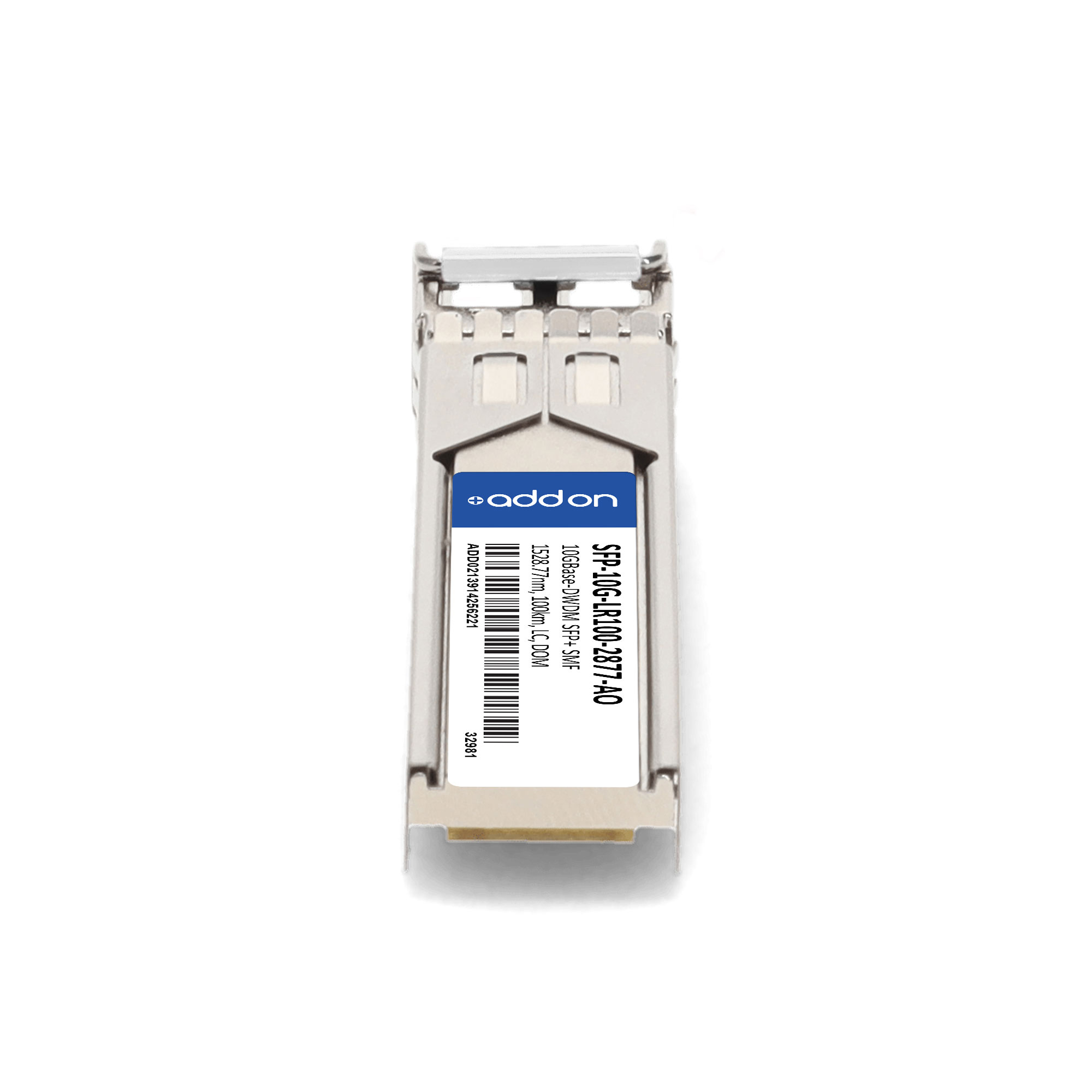 AddOn Networks SFP-10G-LR100-2877-AO. SFP transceiver type: Fiber optic, Maximum data transfer rate: 10000 Mbit/s, Interface type: SFP+. Product colour: Silver, Housing material: Metal, Brand compatibility: Cisco. Maximum voltage: 4 V. Compliance certificates: RoHS, Trade Agreements Act (TAA). Doesn't contain: Lead