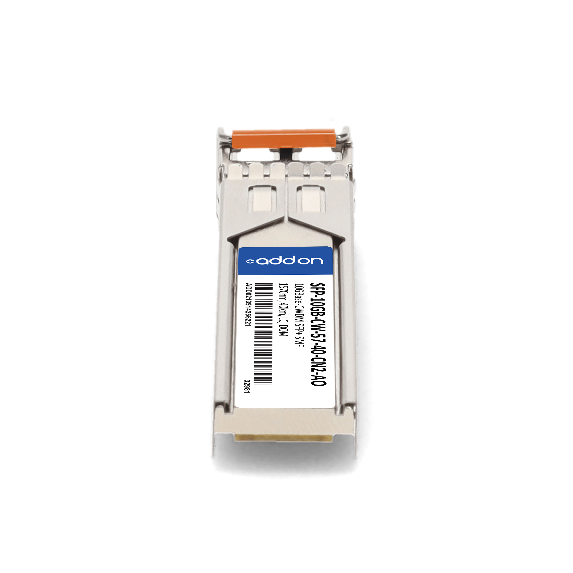 AddOn Networks SFP-10GB-CW-57-40-CN2-AO. SFP transceiver type: Fiber optic, Maximum data transfer rate: 10000 Mbit/s, Interface type: SFP+. Product colour: Silver, Brand compatibility: Ciena. Compliance certificates: Trade Agreements Act (TAA). Quantity per pack: 1 pc(s). Package width: 69.8 mm, Package depth: 120.6 mm, Package height: 30.5 mm |