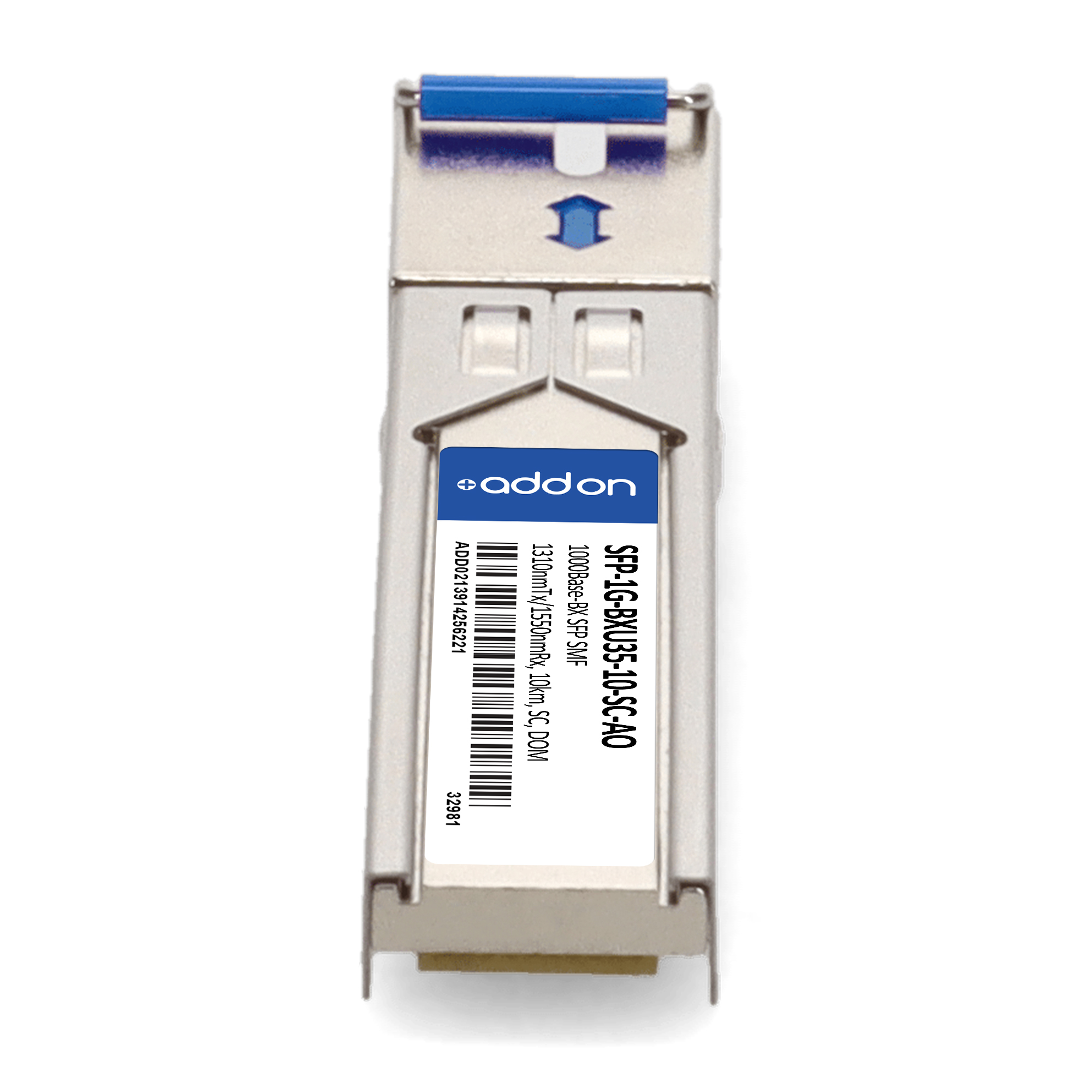 AddOn Networks SFP-1G-BXU35-10-SC-AO. SFP transceiver type: Fiber optic, Maximum data transfer rate: 1000 Mbit/s, Interface type: SFP. Product colour: Silver, Brand compatibility: MSA Compliant. Compliance certificates: Trade Agreements Act (TAA). Quantity per pack: 1 pc(s). Package width: 69.8 mm, Package depth: 120.6 mm, Package height: 30.5 mm |