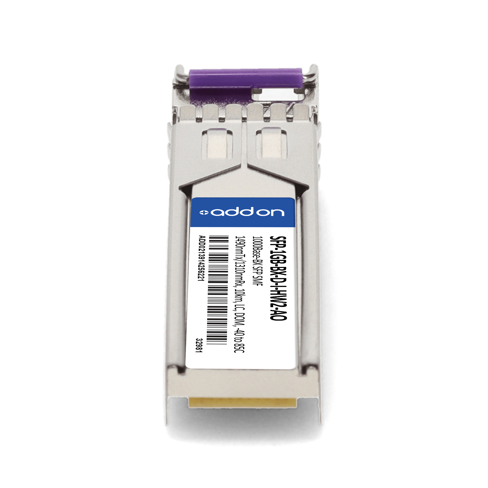 AddOn Networks SFP-1GB-BX-D-I-HW2-AO. SFP transceiver type: Fiber optic, Maximum data transfer rate: 1000 Mbit/s, Interface type: SFP. Product colour: Silver, Brand compatibility: Huawei. Compliance certificates: Trade Agreements Act (TAA). Quantity per pack: 1 pc(s). Package width: 69.8 mm, Package depth: 120.6 mm, Package height: 30.5 mm |