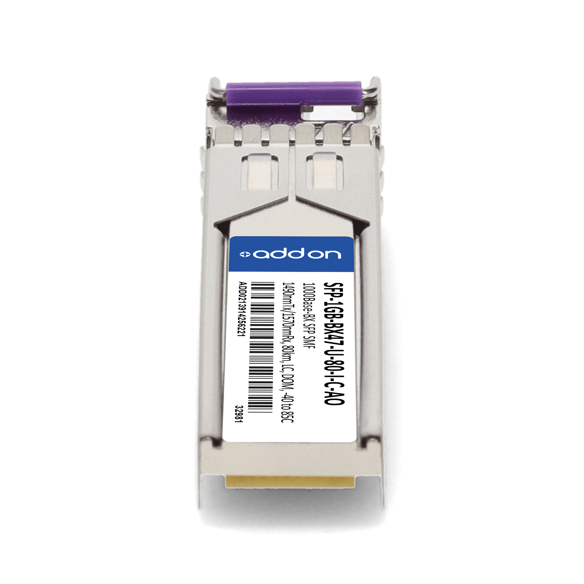AddOn Networks SFP-1GB-BX47-U-80-I-C-AO. SFP transceiver type: Fiber optic, Maximum data transfer rate: 1000 Mbit/s, Interface type: SFP. Product colour: Silver, Brand compatibility: Cisco. Compliance certificates: Trade Agreements Act (TAA). Quantity per pack: 1 pc(s). Package width: 69.8 mm, Package depth: 120.6 mm, Package height: 30.5 mm |