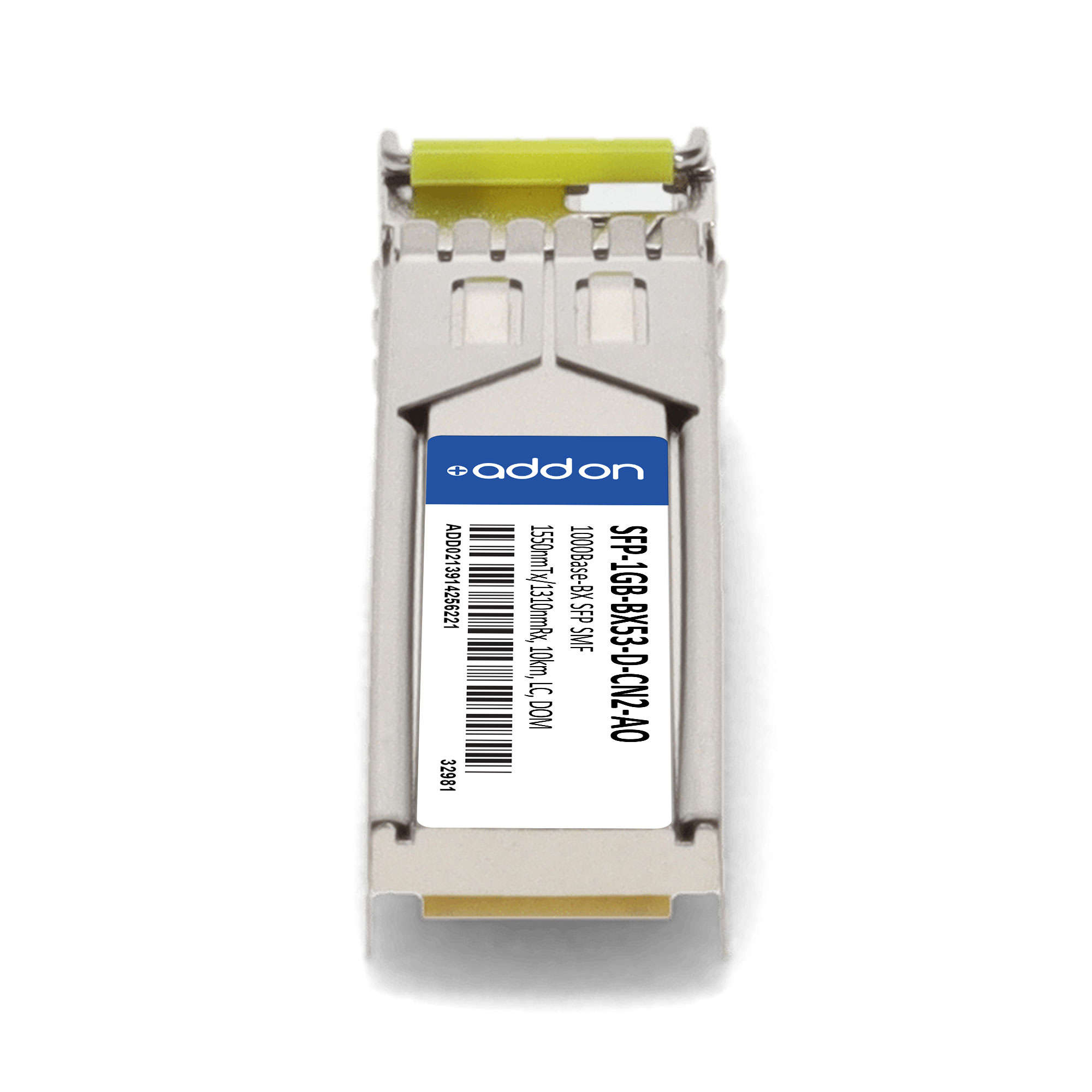 AddOn Networks SFP-1GB-BX53-D-CN2-AO. SFP transceiver type: Fiber optic, Maximum data transfer rate: 1000 Mbit/s, Interface type: SFP. Product colour: Silver, Brand compatibility: Ciena. Compliance certificates: Trade Agreements Act (TAA). Quantity per pack: 1 pc(s). Package width: 69.8 mm, Package depth: 120.6 mm, Package height: 30.5 mm |